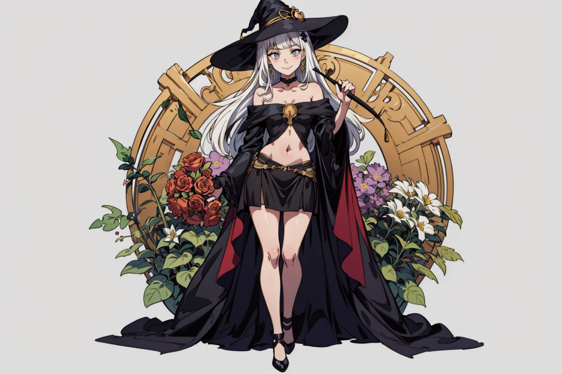 Magical Girl,In the center of the image, a young girl with blonde hair is standing on a rock. Shes wearing a black witch hat and a black dress adorned with gold accents. In her right hand, shes holding a broomstick, and in her left, a book with a yellow cover is held close to her chest.Behind her, theres a large golden clock face, which serves as the backdrop for this scene. The clock face is decorated with a variety of flowers and leaves, adding a touch of nature to the otherwise magical setting.The girl appears to be in a state of quiet contemplation, perhaps pondering over some witchcraft or simply enjoying a peaceful moment under the moonlight. The overall image has a vintage feel to it, suggesting that this could be a scene from a storybook or a fairy tale.
