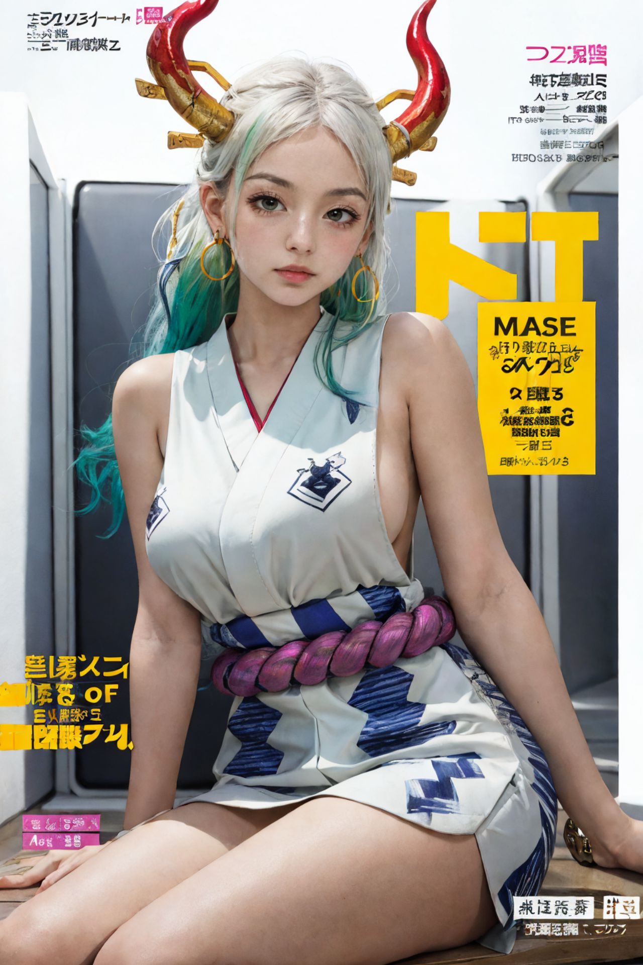 Yamato,One Piece,The image is a cover of the Japanese fashion magazine, MAZE. The central figure is a woman with long, flowing hair painted in vibrant shades of blue and green. Shes adorned with large red horns that add an element of mystique to her appearance. Shes dressed in a white dress, which is accentuated by a striking purple belt cinched at the waist. The dress features cutouts on the sides, adding a touch of boldness to her outfit. Her gaze is directed off to the side, and she carries a serious expression on her face, lending an air of intensity to the image.The magazines title, MAZE, is prominently displayed in large letters at the top of the cover. The cover also includes Japanese text that reads 蝚??? which translates to Volume 9. Theres also a mention of AUF 2015, although its context isnt clear from the image alone.The overall composition of the image places the woman as the focal point, with the text and other elements arranged around her. The use of color is striking, with the blue and green hair contrasting against the white dress, and the red horns adding a pop of color to the scene. The cover effectively conveys the magazines fashion-forward ethos through its choice of imagery and design elements.