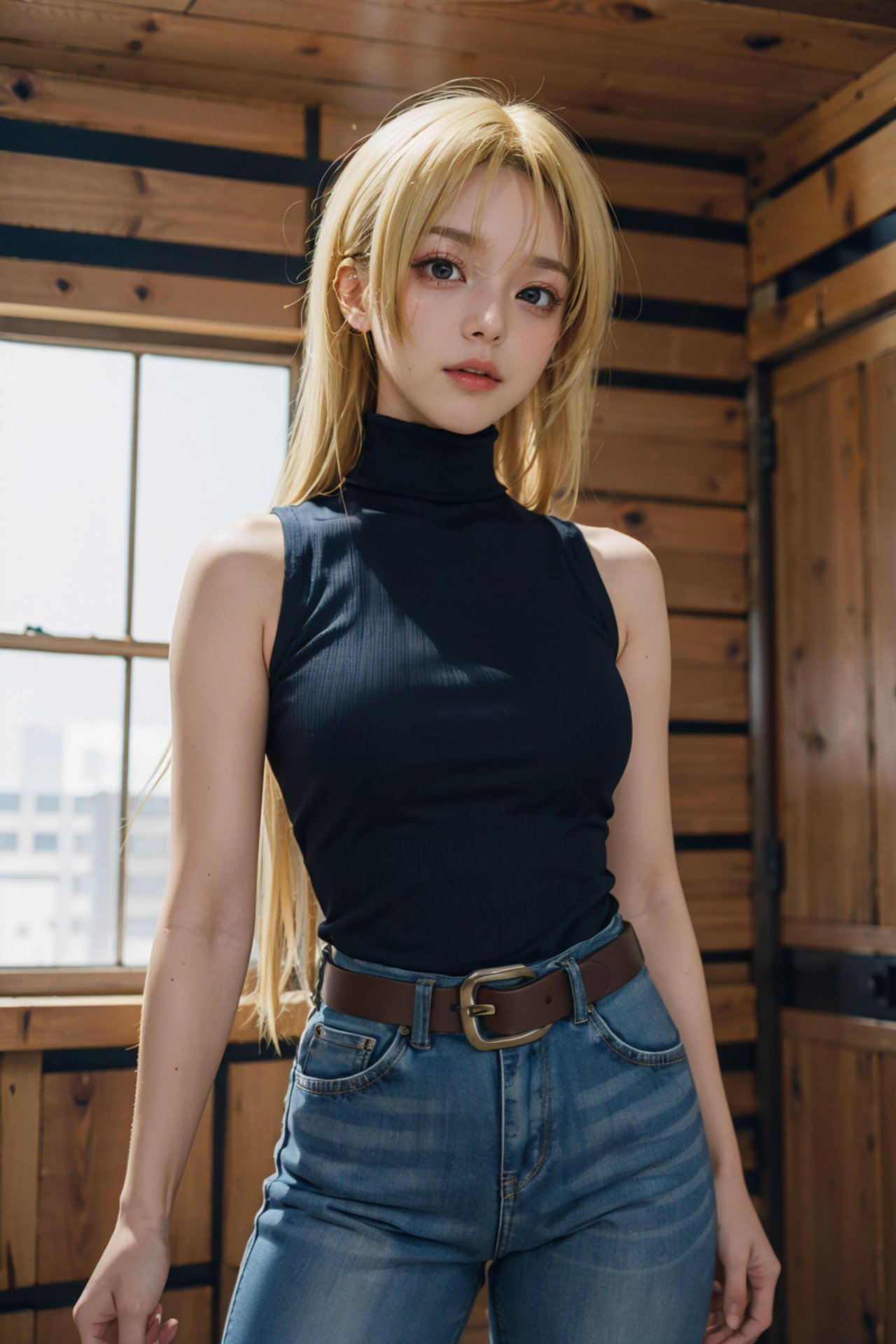 Yuki Tsukumo Jujutsu Kaisen,In the center of the image, a young woman is captured. Shes standing upright, her gaze directed off to the side, creating an air of contemplation. Her attire consists of a black turtleneck and blue jeans, both of which contrast with the natural wood of the room behind her. The room features wooden walls and ceiling, lending a rustic charm to the scene. On one wall, a window can be seen, its presence subtly hinted at rather than overtly displayed. The womans position in the room is central, drawing the viewers attention immediately to her amidst the backdrop of wood tones. There are no discernible texts or other objects in the image. The relative positions of the objects remain constant, with the woman as the focal point and the room serving as a supportive context.