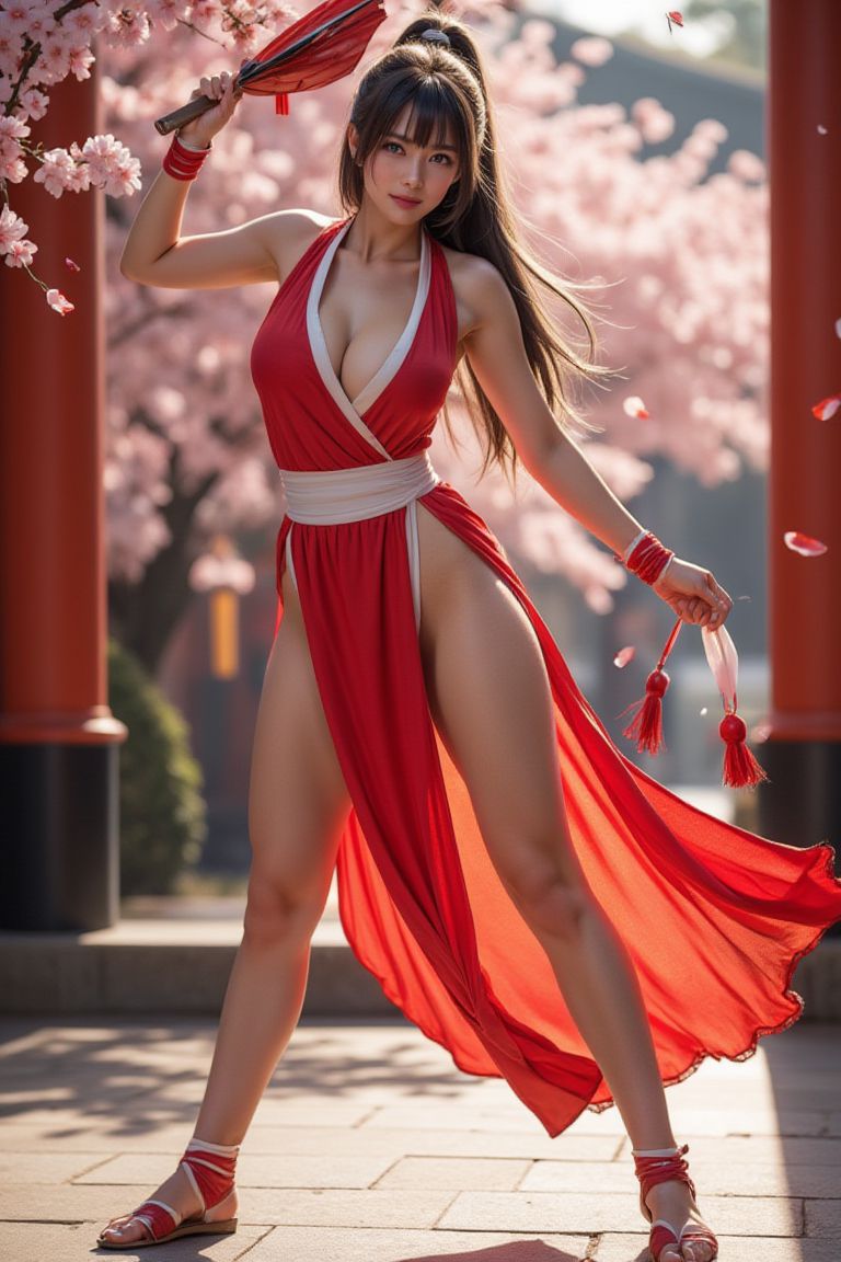 Shiranui Mai, 不知火舞,In the image, a woman is captured in mid-dance on a brick path. Shes dressed in a vibrant red dress that features a high slit and thin straps, revealing her bare legs. In her left hand, she holds a fan painted in alternating stripes of red and white. Her right arm extends out to the side as if caught in a gust of wind.The background is a soft blur of pink cherry blossom trees, their petals scattered around like confetti. A red gate peeks through this floral backdrop, adding another splash of color to the scene. The womans position on the brick path and her dynamic pose suggest movement and energy. Despite the blurred background, the focus remains firmly on the dancing woman, creating a sense of depth in the image.There are no discernible texts or countable objects in the image. The relative positions of the objects indicate that the woman is the central figure, with the cherry blossom trees and red gate providing a colorful backdrop to her dance. The image captures a moment of joy and freedom, as if frozen in time.