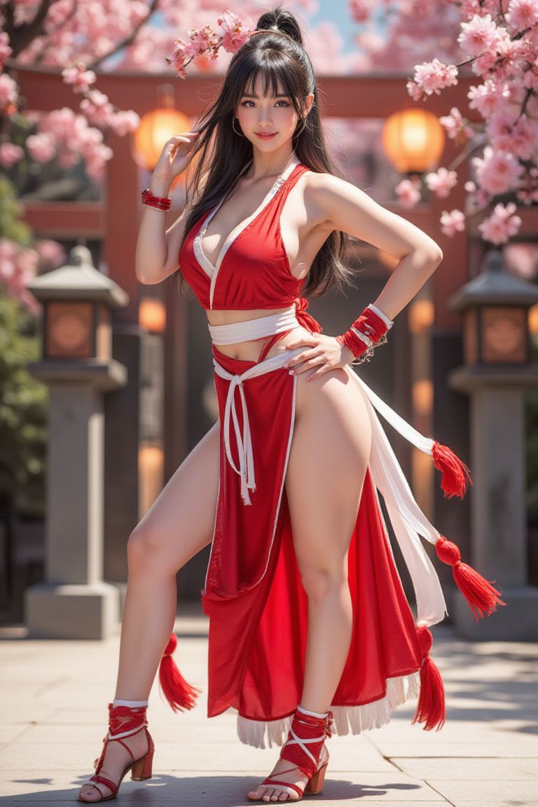 Shiranui Mai, 不知火舞,In the image, a young woman is captured in a moment of elegance. She is adorned in a vibrant red traditional Chinese dress, known as a qipao, which has long sleeves and a high collar. The dress cascades down to form a flowing skirt, adding to her poised demeanor.The womans hair is styled into a neat bun, complementing the overall traditional aesthetic of her attire. She stands confidently with one hand resting on her hip and the other lightly touching the head of a nearby lantern post, suggesting a sense of familiarity and comfort in her surroundings.Behind her, a backdrop of cherry blossom trees paints a serene setting under a clear blue sky. The cherry blossoms, known for their fleeting beauty, add a touch of natures charm to the scene.The womans position relative to the cherry blossom trees indicates she is at the forefront of this picturesque background, creating a striking contrast between her vibrant red dress and the soft pink hues of the cherry blossoms.There are no discernible texts or countable objects in the image. The focus remains on the woman and her interaction with her environment, captured within this single, powerful frame.