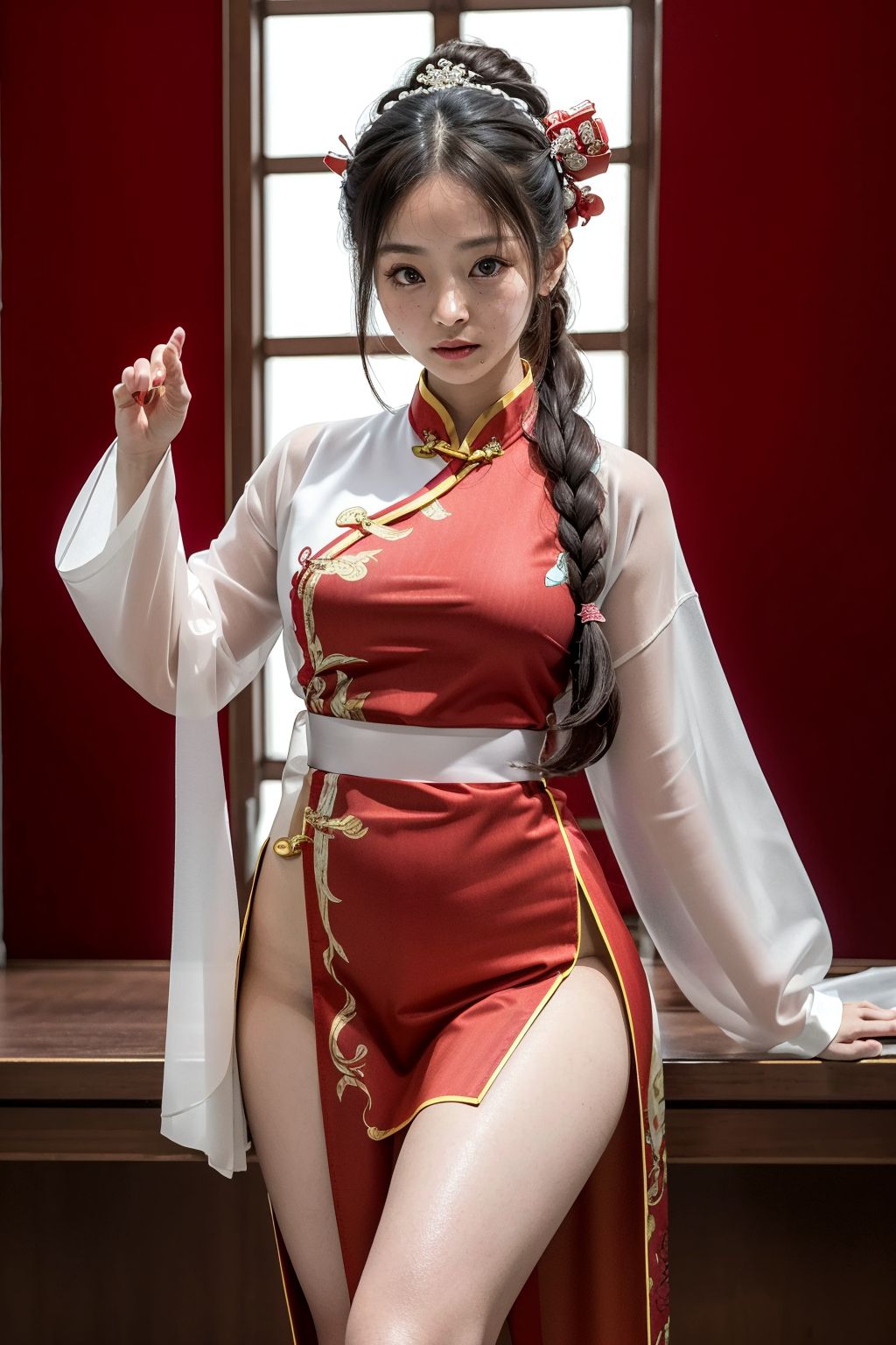 Chinese daughter clothing,The image captures a young woman, adorned in traditional Chinese attire, standing against a backdrop of a red wall with white windows. The womans outfit is a vibrant blend of color and design. She wears a long sleeved blouse that is predominantly red, but the sleeves are accented with gold trim, adding a touch of elegance to her ensemble. Complementing the blouse is a skirt in the same shade of red, but it is highlighted with gold accents, mirroring the sleeves of the blouse.The womans hair is styled in an intricate updo, a common hairstyle in traditional Chinese culture. A flower hair accessory graces her head, adding to the authenticity and cultural richness of her attire.She strikes a pose that exudes confidence and grace. Her left hand rests on her hip, while her right hand points towards something outside the frame, suggesting a sense of direction or emphasis towards that point. The precise location of these objects is not discernible from the image.The image does not contain any text or additional objects. The relative positions of the womans accessories are clear: the flower hair accessory is on top of her head, and the updo is part of her hairstyle. The colors in the image are mainly red, gold, and white, with the red wall serving as the backdrop and the womans outfit providing a contrast.This description is based on the visible elements in the image and does not include any speculative or imaginary content. It provides a detailed account of the image, focusing on object types, colors, counts, actions, locations, and texts.
