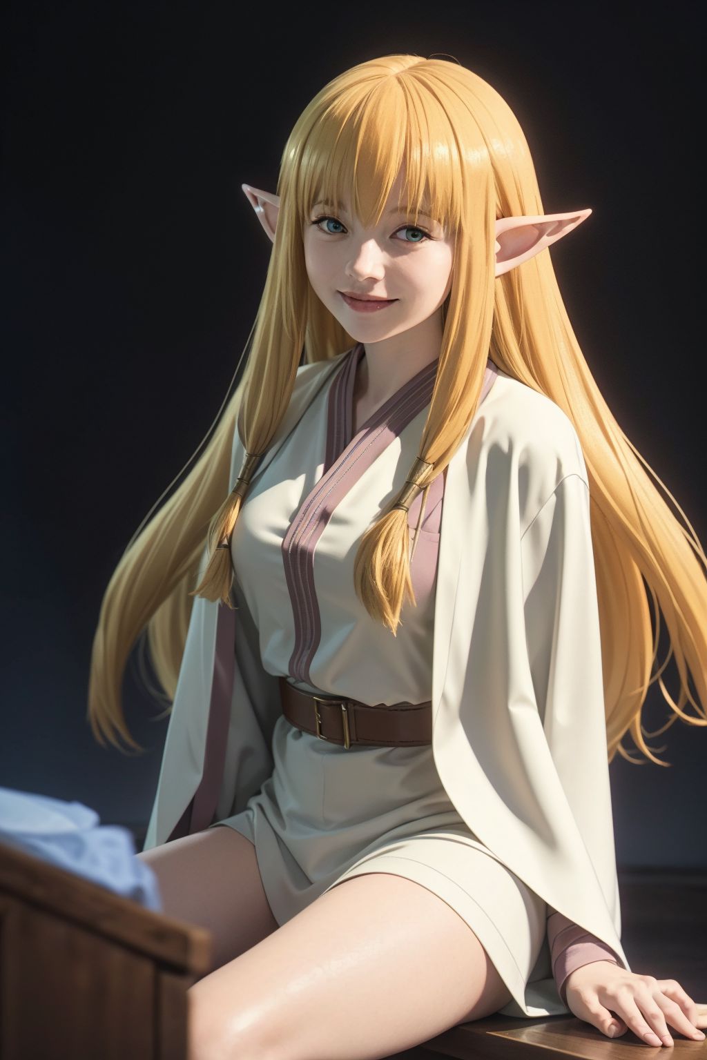 Serie,Frieren,In the image, a young woman is the central figure. She has long blonde hair that cascades down her shoulders and pointed ears, giving her an otherworldly appearance. Her attire consists of a white outfit adorned with pink accents, adding a touch of color to her ensemble. Around her neck, she wears a brown belt cinching her waist.She is seated on a wooden stool, her body language relaxed as she looks directly at the camera with a slight smile playing on her lips. The backdrop against which she sits is dark, serving to highlight her and draw attention to her details.The image does not contain any discernible text or additional objects. The womans position on the stool and her direct gaze into the camera suggest that this could be a posed portrait. The overall composition of the image places the woman at the center, with all elements converging towards her. There is no other action depicted in the image. The focus is solely on the woman and her immediate surroundings.