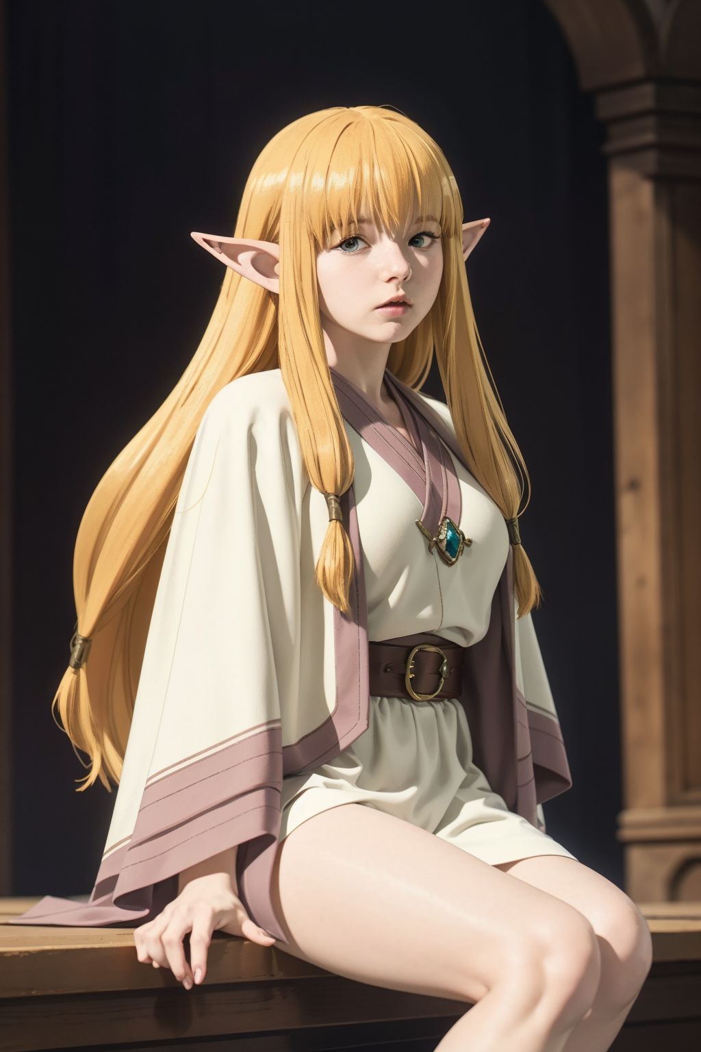 Serie,Frieren,In the center of the image, a young girl with long blonde hair and pointed ears is seated on a wooden bench. Shes wearing a beige dress cinched at the waist with a brown belt, complemented by a purple cape draped over her shoulders. Her gaze is directed to the left, and her expression is serious, almost as if shes deep in thought.The background of the image is dark, providing a stark contrast to the girl and the bench. On the right side of this backdrop, theres a wooden archway, its design intricate yet simple. The overall scene suggests an atmosphere of quiet contemplation or anticipation, with the girl at the heart of it all.