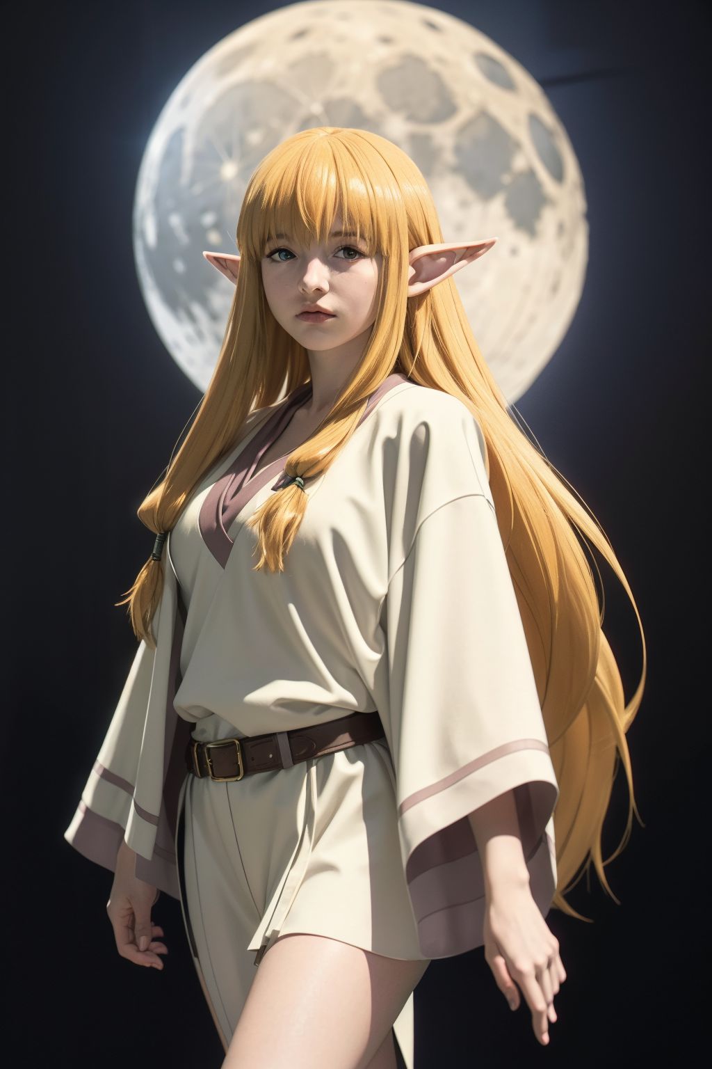 Serie,Frieren,In the center of the image, a young woman with long blonde hair and pointed ears stands against a dark blue background. She is dressed in a beige outfit that features a high collar and sleeves, adding an air of elegance to her appearance. Her brown belt cinches at her waist, contrasting with the lighter color of her top.Her gaze is directed off to the side, lending a serious expression to her face. The angle of her pose suggests she is standing in profile, allowing a clear view of her outfit and features.In the upper right corner of the image, a full moon casts a soft glow on the scene, its light illuminating the womans face and creating a serene atmosphere. The moons presence adds an element of intrigue to the image, suggesting that this could be a scene from a fantasy or sci-fi setting. Despite the fantastical elements, the image is grounded in reality through the precise detailing of the womans outfit and the realistic depiction of her features. There are no texts or other discernible objects in the image. The relative positions of the objects are such that the woman is the central figure, with the moon providing a secondary point of interest in the upper right corner. This detailed description provides an accurate representation of the image content based on what can be confidently determined from it.