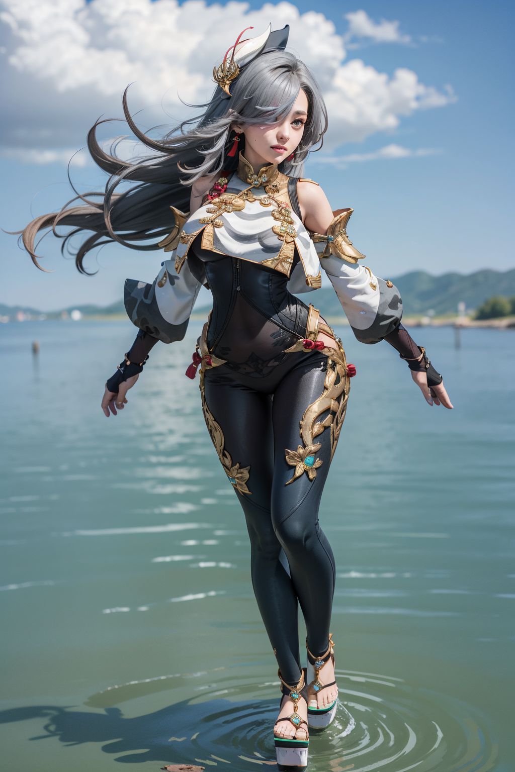 Chelsea Kwoka,In the center of the image, a woman with long gray hair is seen standing on one leg. Shes wearing black and gold armor that matches the color scheme of her white top adorned with red and gold accents. A red headband adds a pop of color to her ensemble. Shes positioned in front of a serene body of water, where two boats are visible in the distance. Above them, the sky is a clear blue, dotted with fluffy white clouds. The woman appears to be looking off into the horizon, perhaps lost in thought or simply enjoying the view. Theres no text present in the image. The relative positions of the objects suggest that the woman is closer to the viewer than the boats on the water. The image captures a moment of tranquility and introspection against a backdrop of natural beauty.