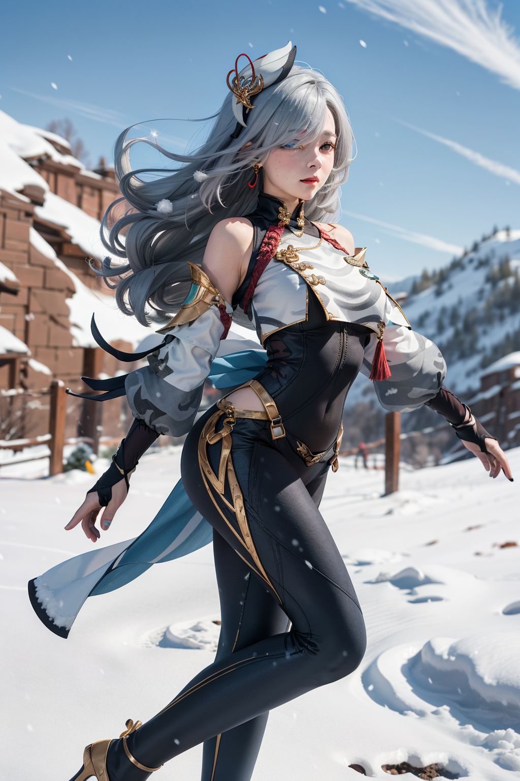 Chelsea Kwoka,In the image, a young woman with gray hair is the main subject. She is adorned in an outfit that has hues of blue and gold. The ensemble includes a top with long sleeves, a skirt, and leggings, all complementing her attire. She stands on a snowy mountain, adding to the chilly atmosphere of the scene. Her gaze is directed towards something or someone off-camera, suggesting a sense of engagement or anticipation. In her left hand, she holds a sword, indicating that she might be in a state of readiness or defense. The sword, combined with her outfit and the snowy backdrop, creates an image of resilience and strength.The image does not contain any discernible text. The relative positions of the objects suggest that the woman is standing upright, facing off-camera, with her right hand holding the sword. The snowy mountain extends behind her, providing a stark contrast to her colorful attire. Overall, the image captures a moment of quiet intensity in a winter setting.