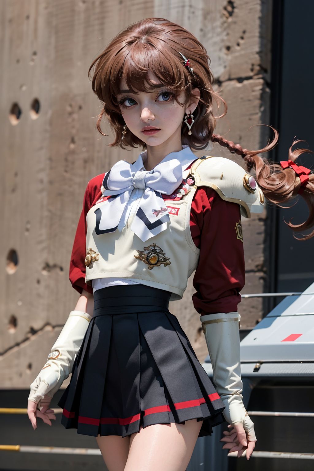 獅堂光 魔法騎士雷阿斯 Hikaru_Shidou,In the image, a young girl with brown hair is captured. Shes adorned with a vibrant red bow in her hair and matching earrings that add to her youthful charm. Shes dressed in a striking outfit of black and gold, which stands out against the backdrop of the cityscape.Shes standing in front of a brick wall, which provides a rustic contrast to the modernity of the building behind it. The building features a glass window, reflecting the world outside and adding depth to the scene.The girl is positioned on the right side of the image, her gaze directed towards the left, as if something has caught her attention. Her stance suggests shes in motion, perhaps walking or dancing, though the exact action is not clear from the stillness of the photograph.There are no discernible texts in the image, and the relative positions of the objects suggest a typical urban setting with the girl possibly being the main subject. The brick wall, city buildings, and glass window form the background, providing context but not detracting from the central figure - the young girl in her colorful attire. This description is based on the visible elements in the image and does not include any speculative or imaginary content. It provides a detailed account of the scene captured in the photograph.