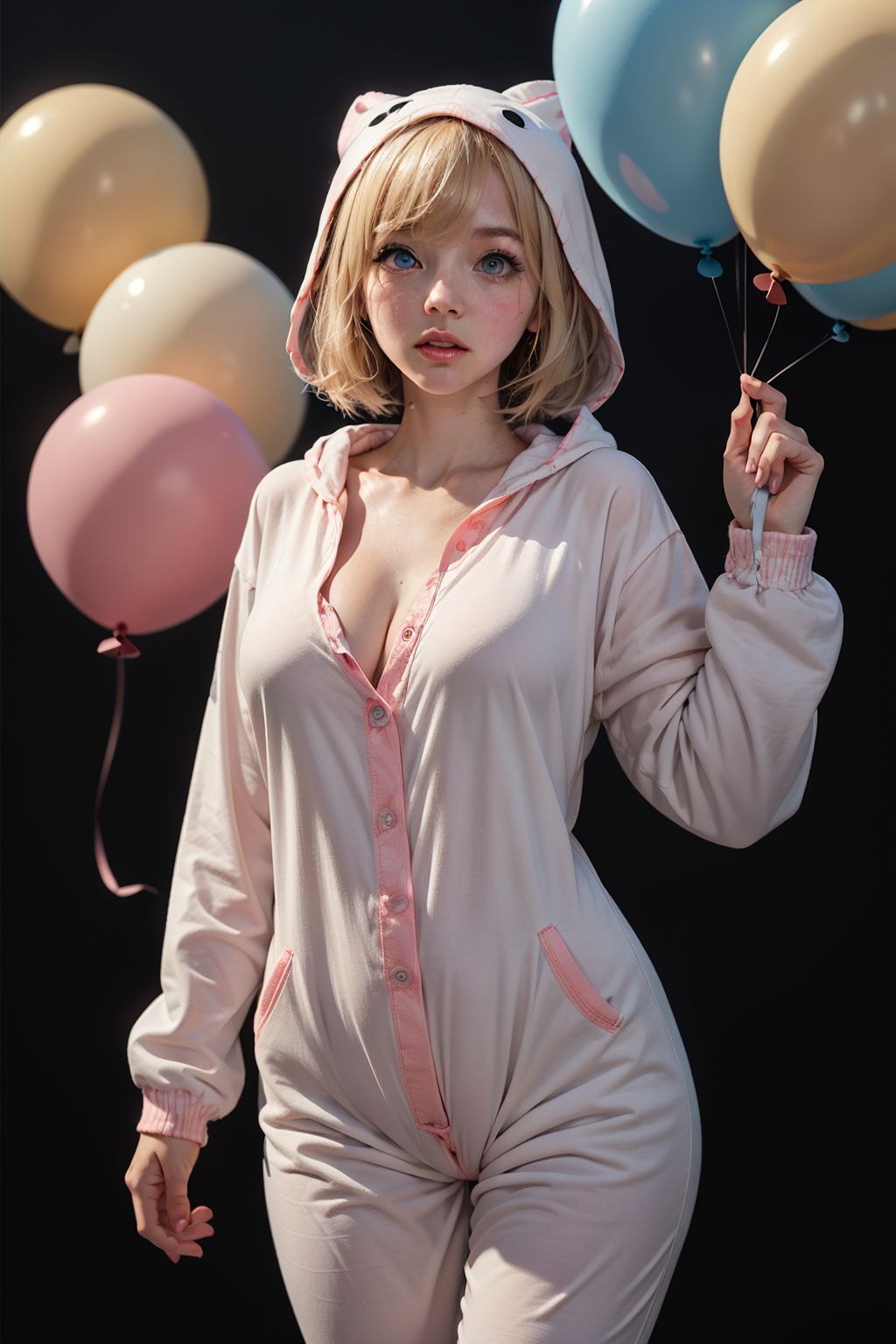 White Rabbit in a Dream,In the center of the image, a young woman with blonde hair is standing. Shes dressed in a pink pajama set that includes a hooded top and matching pants. The top features a plunging neckline, adding a touch of elegance to her outfit.Shes holding two large balloons in her hands. One balloon is blue and the other is beige, both floating above her head as if shes just blown them up. The background against which she stands is black, providing a stark contrast that makes her and the colorful balloons stand out. The balloons are positioned directly behind her, suggesting theyre being presented or offered.Theres no text visible in the image, and the focus is solely on the woman and the balloons. The relative position of the objects confirms that the woman is the main subject of this image, with the balloons serving as a secondary element to draw attention to her. The image captures a moment, perhaps of celebration or gift-giving, but leaves the context to the viewers imagination. Its a simple yet striking composition that tells a story without words.