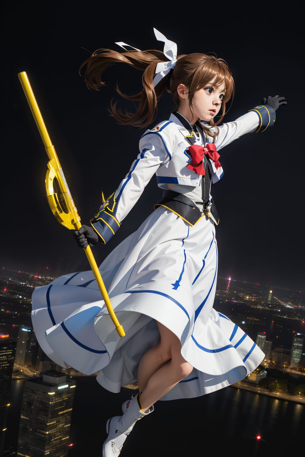 Takamachi Nanoha,Magical girl,In the heart of a bustling city, under the dark night sky, a young girl with brown hair is seen soaring high above. Shes holding a golden key in one hand and a black sword in the other, ready for any adventure that might come her way. Dressed in a white outfit adorned with blue accents and a red bow on her chest, she stands out against the cityscape.Her arms are extended wide, as if embracing the world around her. The city below is a blur of lights, buildings, and streets, painting a picture of life continuing its rhythm undeterred by her flight. Despite the distance between them, theres an undeniable connection between the girl and the city - two worlds intersecting for a moment, yet each going on their own journey.There are no discernible texts or other objects in the image, and the relative positions of the objects remain constant as they are fixed in time by the photograph. The girl, the key, and the sword are all clearly visible and identifiable, each playing its part in this captivating scene. The image captures a moment frozen in time, a snapshot of a girls journey high above the city lights.