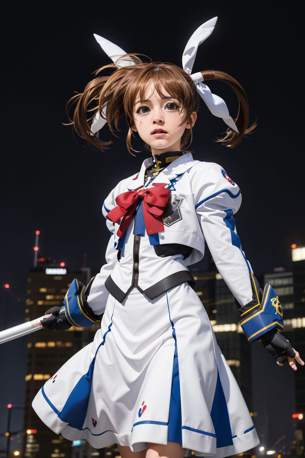 Takamachi Nanoha,Magical girl,In the stillness of a city at night, a young girl stands resolute on a rooftop. Her attire is striking - a white and blue dress adorned with gold accents, a red bow adding a pop of color against her shoulder-length brown hair that falls freely around her shoulders. In her hands, she wields a sword, its metallic surface glinting under the city lights.The cityscape behind her is alive with towering buildings piercing the night sky, their countless windows illuminated in a myriad of colors. Among these structures, a ferris wheel can be spotted, its silhouette adding to the urban charm of the scene. Despite the bustling city around her, the girl stands alone on the rooftop, a solitary figure against the backdrop of the city at night. There is no text visible in the image. The relative positions of the objects suggest that the girl is at a higher elevation than the buildings and ferris wheel behind her. The image captures a moment frozen in time, a snapshot of a young woman standing defiantly against the backdrop of a city that never sleeps.