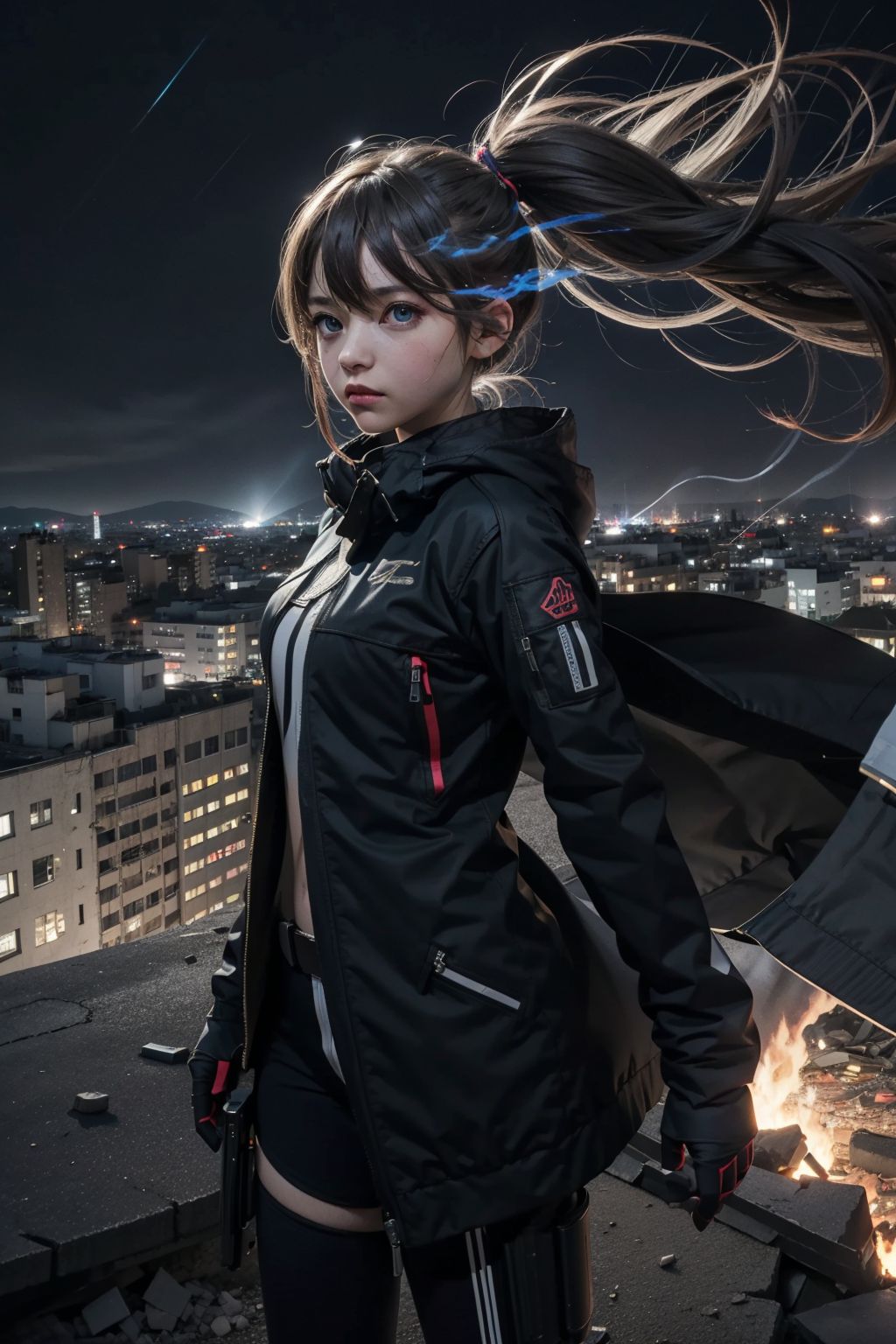 black Rock Shooter,In the image, a young woman stands on a rooftop against the backdrop of a city skyline. She is dressed in a black jacket and blue shorts, with her arms crossed over her chest. Her hair is styled in a high ponytail, adorned with a blue headband that adds a pop of color to her outfit.The background reveals a cityscape at night, illuminated by streetlights and building lights. The buildings vary in height and design, contributing to the urban landscape. Despite the bustling city behind her, the woman stands out, her gaze directed off to the side, suggesting she is lost in thought or perhaps observing something beyond the frame of the image.There are no discernible texts or countable objects in the image. The relative position of the woman to the cityscape suggests she is at a higher elevation compared to the buildings, indicating shes on a rooftop. The image does not provide any additional details that could be confidently described. The overall composition of the image places the woman as the central focus, with the city serving as a dramatic backdrop.