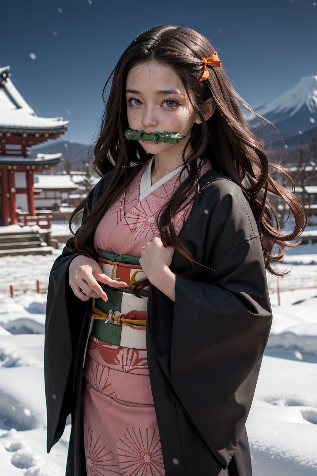 Nezuko Kamado,Demon Slayer,In the image, a young woman is standing in front of a traditional Japanese temple. She is adorned in a black kimono that is beautifully decorated with pink and red patterns. The kimono drapes elegantly around her, its long sleeves extending past her wrists.The woman has styled her dark hair in loose waves, cascading down her shoulders. A delicate pink flower is tucked into the side of her hair, adding a touch of color to her dark locks. She holds a red fan in her right hand, which stands out against her black kimono. The red fan seems to be an accessory, possibly used for ceremonial purposes.The temple behind her is traditional Japanese architecture, featuring a red roof that contrasts with the white walls. The temples design and structure are indicative of a specific period or region within Japan.Above them both, the sky stretches out in a clear blue expanse, devoid of any clouds. The absence of clouds suggests a bright and sunny day. The image does not contain any text or other discernible objects.The womans position relative to the temple places her in the foreground, drawing attention to her attire and actions. Her location in front of the temple might suggest that she is participating in a ceremony or event related to the temple. However, without additional context, this interpretation remains speculative. Overall, the image captures a moment of cultural significance, featuring a young woman in traditional Japanese attire standing before a traditional Japanese temple under a clear blue sky. The precise location or specific event is not discernible from the image alone.