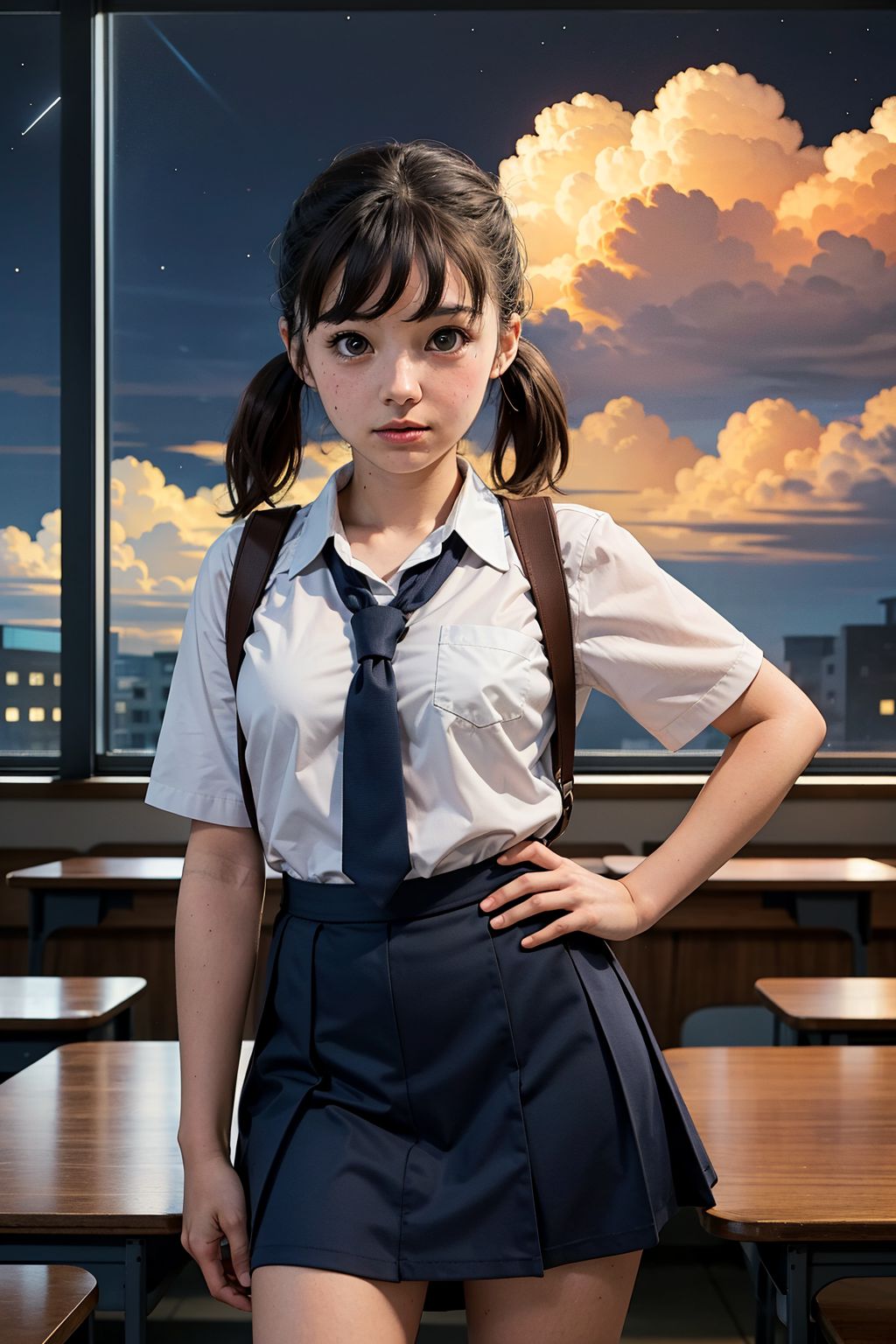 Shizuka Minamoto 源靜香,In the image, a young woman is standing in a classroom setting at night. She is dressed in a white collared shirt and a blue skirt, complemented by black suspenders. A pair of brown shoes complete her outfit. Her left hand is confidently placed on her hip, while her right hand rests lightly on the back of a wooden chair.The room around her is dimly lit, creating an atmosphere of quiet study or contemplation. In front of her are several other chairs, all identical in design and color to the one she stands in front of. The background of the image reveals a large window, through which we can see a cityscape at night, complete with buildings and clouds. The woman is standing in front of this window, suggesting that she might be looking out over the city.Overall, the image captures a moment of solitude and introspection, as the woman stands alone in the classroom under the city lights.