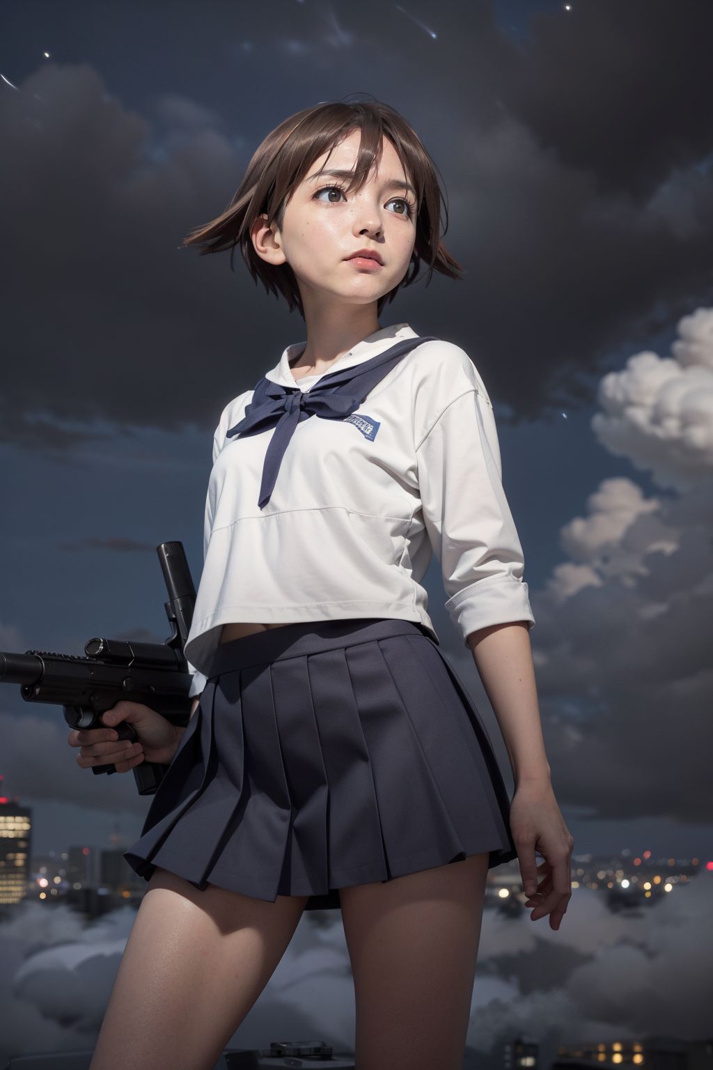 Yoshika Miyafuji,Strike Witches,In the image, a young girl is standing on a rooftop, her silhouette stark against the dark sky. Shes dressed in a white shirt and blue skirt, with a matching blue bow adorning her hair. In her hand, she holds a black gun, pointed towards something unseen in the distance. Her gaze is directed off to the side, suggesting that she might be looking at something or someone outside of the frame.The city skyline stretches out behind her, dotted with buildings and illuminated by the glow of distant lights. The sky above is filled with clouds, adding a sense of depth and vastness to the scene. Despite the darkness of the night, the girl stands out, her figure a stark contrast against the backdrop of the cityscape. There are no discernible texts or other objects in the image. The relative position of the girl suggests she is standing at some distance from the edge of the rooftop, looking down towards the city below. The overall scene gives an impression of solitude and determination.