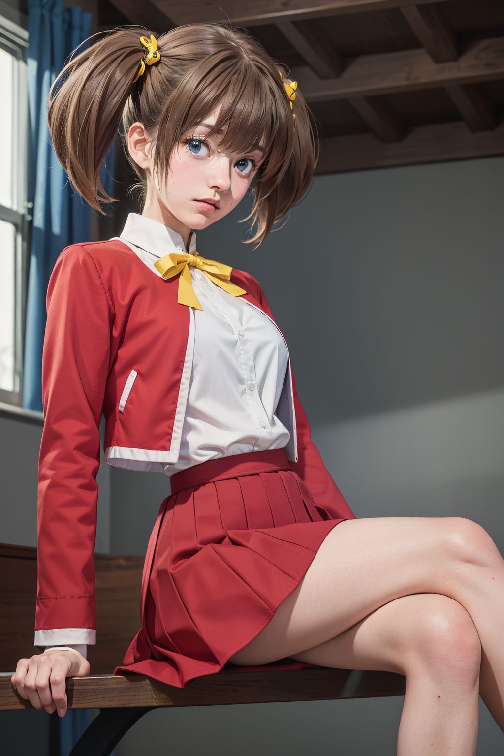 Tomochika Dannoura,Instant Death,In the center of the image, a young girl with vibrant blue eyes is seated on a wooden bench. Her hair, a rich shade of brown, is adorned with two bows, one on each side of her head. Shes dressed in a striking red and white outfit, complete with a matching red skirt that contrasts beautifully with her white blouse. The bench shes sitting on appears sturdy, made of wood that matches the ceiling visible behind her. A window punctuates the wall in the background, adding depth to the scene. The girls gaze is directed off to the side, and a slight smile graces her face, hinting at a moment of quiet contemplation or perhaps anticipation of an event yet to unfold.