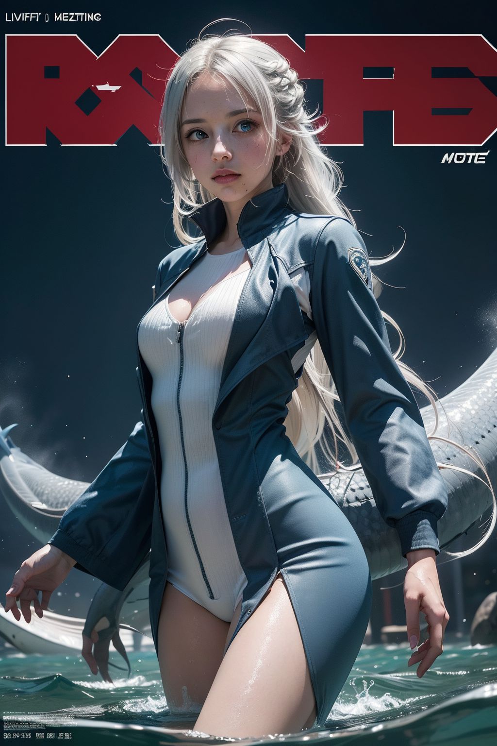 Leviathan Mythical Creature,The image is a cover of the September 2015 issue of Rock Hard Magazine. Dominating the cover is a woman with blonde hair, standing in front of a white shark. She is dressed in a blue jumpsuit and holds a black object in her hand. The background is dark blue with a cityscape visible under a clear sky. The text on the cover reads LIFE + SHOCKING + NOTE, which are likely headlines or teasers for articles within the magazine.