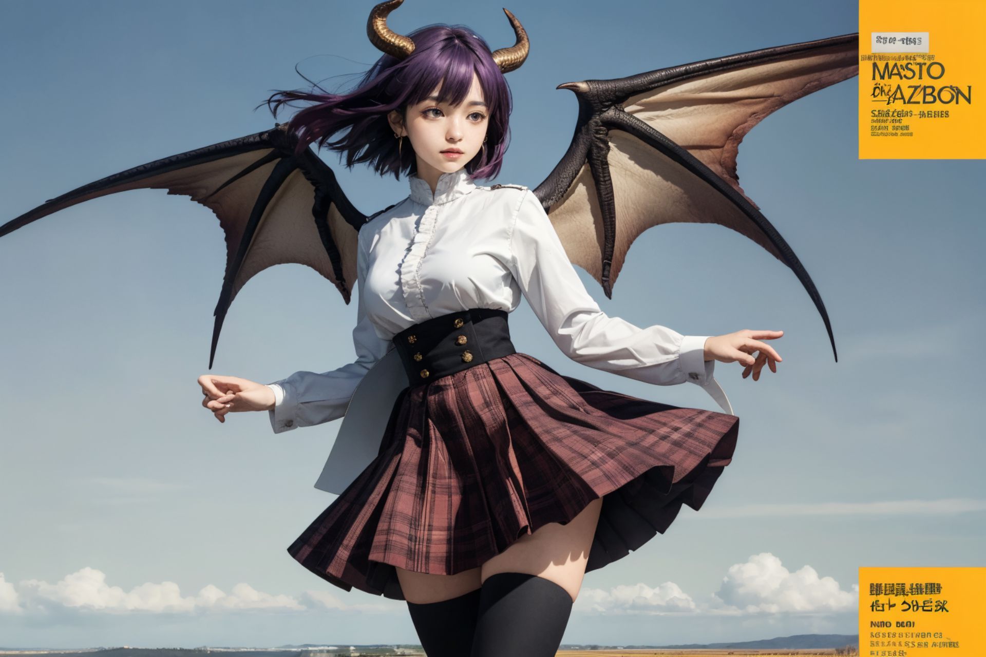 Grea, Shingeki no Bahamut,In the image, a young woman with purple hair and horns is the main subject. Shes dressed in a white blouse adorned with gold accents, paired with a skirt thats striped in shades of pink and brown. Her arms are outstretched, as if shes performing or expressing herself dramatically. The backdrop is a serene blue sky dotted with fluffy clouds, providing a stark contrast to her vibrant appearance.Two yellow labels are visible in the image. One label is located at the top right corner, while the other is situated at the bottom left corner. Both labels contain text that reads MASTRO MASTROMANIAZ 1, possibly indicating the brand or artist associated with the image. The womans dynamic pose and the fantastical elements of her appearance suggest a narrative open to interpretation.