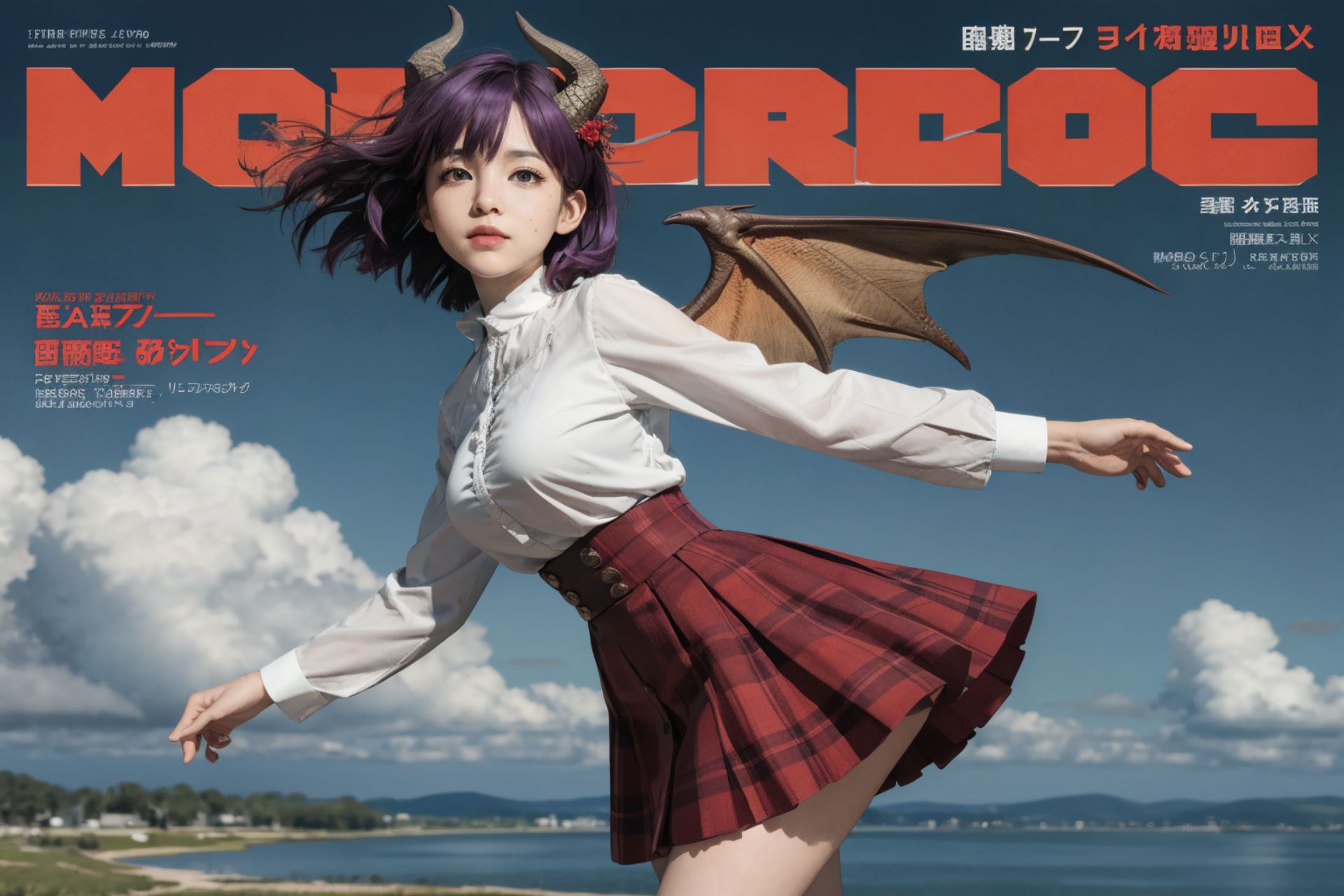 Grea, Shingeki no Bahamut,The image is a vibrant cover of a Japanese magazine, Mobiroc. The main subject is a young woman with striking blue hair and horns on her forehead, adding an element of fantasy to the scene. Shes dressed in a red plaid skirt that contrasts with her white blouse. Her arms are outstretched as if shes in mid-air or perhaps flying, creating a sense of motion and excitement.The background is a picturesque landscape featuring a beach and a clear blue sky dotted with fluffy white clouds. The location suggests an outdoor setting, possibly near the sea, adding to the serene yet fantastical atmosphere of the image.In addition to the main subject, theres text on the cover indicating that this issue features an interview with King of Monsta. This could suggest an interesting piece inside the magazine about someone or something named King of Monsta.Overall, the image is a blend of fantasy and reality, featuring a woman with unusual characteristics set against a beautiful natural backdrop. The presence of text hints at intriguing content within the magazine itself.