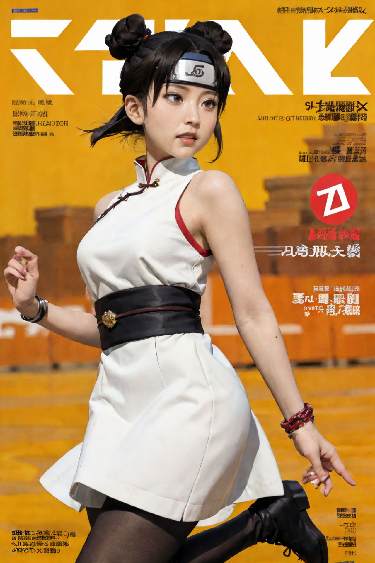 Tenten,Naruto,In the center of the image, a woman is captured mid-stride on a city street. Shes dressed in a traditional Chinese outfit that includes a white blouse adorned with red stripes down the sleeves, paired with black pants and a gold belt buckle. On her head, she wears two large black hair clips, adding to the authenticity of her attire.The backdrop against which she stands is an urban setting, featuring a yellow building under a clear blue sky. The cityscape adds a layer of depth to the image.The womans position in the center of the image draws the viewers attention immediately. However, the magazine cover also includes text that provides additional context about her character and story.At the top left corner of the cover, the title K-POP is prominently displayed in bold black letters against a white background. This suggests that the woman may be a figure associated with K-pop, a genre of popular music originating from South Korea.Towards the bottom left, the text Korean Wave is written in black letters on a white banner. The term Korean Wave refers to the global popularity of Korean culture, particularly in entertainment and fashion, over the past few decades.Finally, at the bottom right corner of the cover, theres text in Chinese characters that reads ?絲?? which appears to be the name of the woman depicted on the cover. This suggests that she may be a public figure or celebrity associated with these terms.Overall, the image presents a dynamic scene of a traditional Chinese dancer making her way through a city street, set against the backdrop of a bustling urban environment. The accompanying text provides context about her character and story, indicating her association with K-pop and the Korean Wave, and suggesting that she may be a public figure known by the name ?絲??
