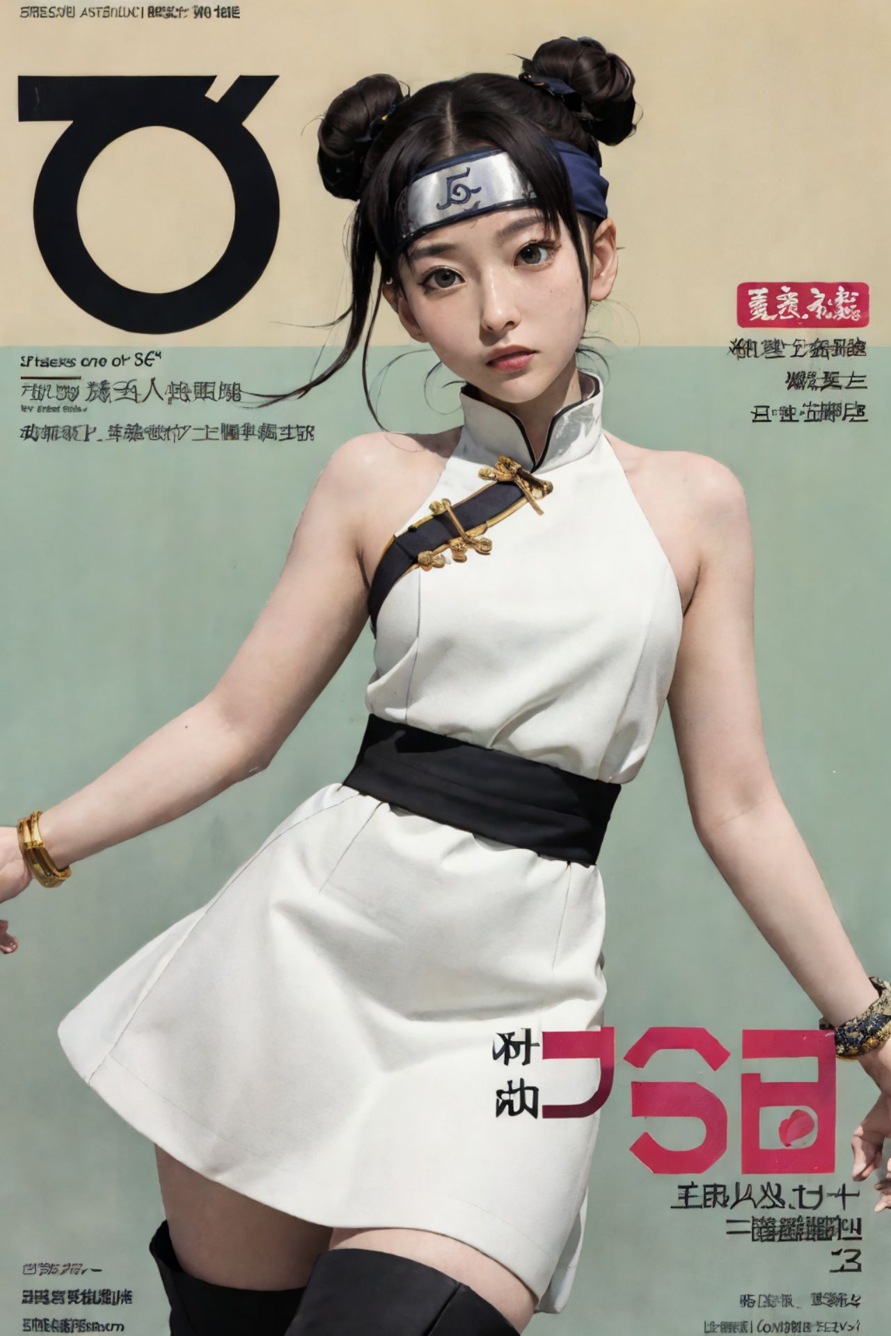 Tenten,Naruto,The image features a woman adorned in traditional Japanese attire, specifically a kimono. The kimono is predominantly white, accented with black and gold details. Complementing the outfit are two distinctive black hair buns that she wears on either side of her head.She stands against a backdrop of a vibrant green color, which adds a stark contrast to her attire. Her gaze is directed off to the side, lending an air of contemplation or perhaps anticipation to her demeanor.On the left side of the image, theres text in Chinese characters. The right side of the image carries the English text OK! Magazine along with a bold red number 3. The placement of these texts suggests that this image might be from a magazine issue, specifically OK! Magazine, and it could be the third page.The overall composition of the image places the woman as the central focus, with her traditional Japanese attire standing out against the modern backdrop. The Chinese characters on one side and the English text on the other suggest a blend of cultural elements in this image.