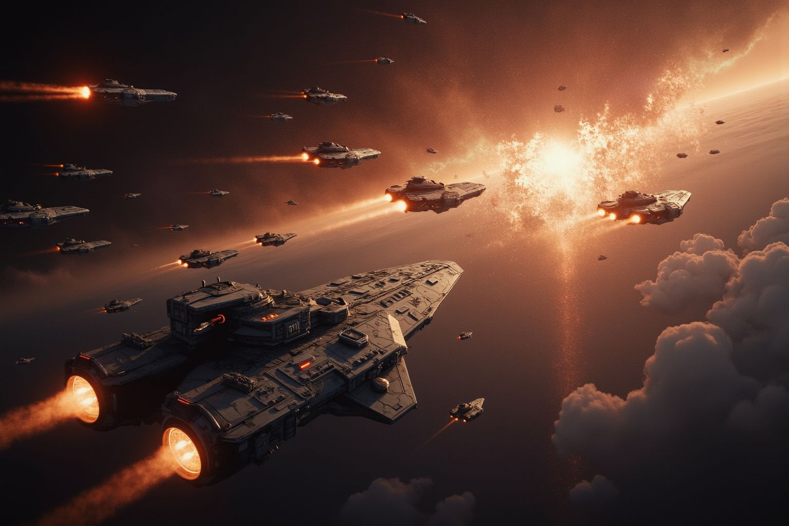 battle spaceThe image presents a captivating scene of a futuristic battle. Dominating the sky is a large, black spaceship with an angular design and glowing orange lights at the front. This spaceship is not alone; its accompanied by smaller spaceships scattered across the dark blue background. Each of these smaller ships shares the same design as the larger one, characterized by their sharp angles and orange lights.The largest spaceship, despite its size, seems to be under attack from the other spaceships. Its surrounded by a flurry of activity, with some spaceships appearing to explode in the top right corner of the image, creating an atmosphere of intense action.Adding to the drama is a large explosion situated on the left side of the sky, perhaps indicating a significant event or conflict happening elsewhere off-frame. The entire scene is rendered in 3D, which adds depth and realism to the fantastical setting. Its a dynamic depiction of a space battle, where each element contributes to the overall narrative of an interstellar struggle.