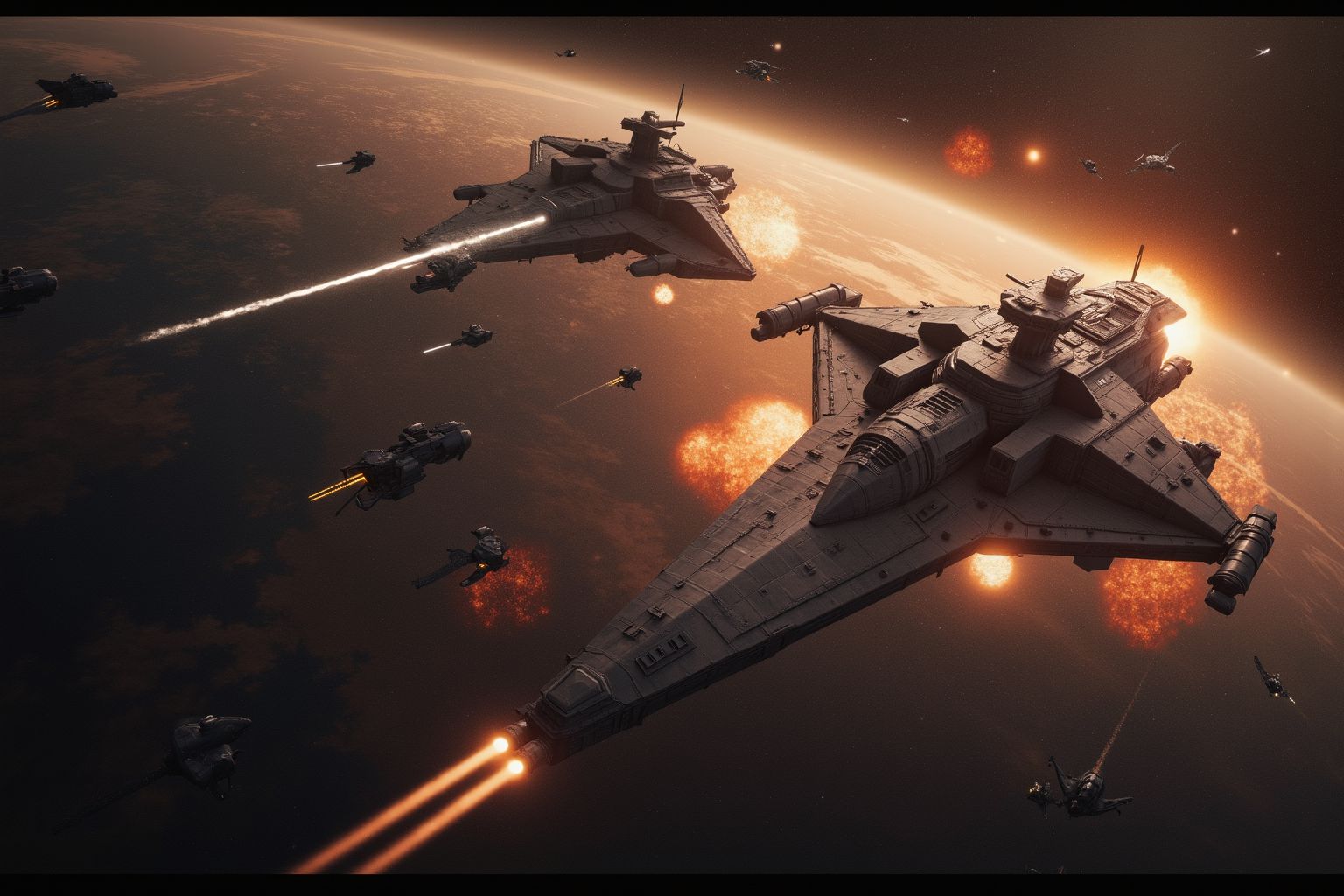 battle spaceThe image presents a dramatic scene set in the vast expanse of space. Dominating the frame are two large ships, their gray exteriors gleaming under the harsh light of the setting sun. The larger ship on the right boasts multiple levels, hinting at a bustling interior and advanced technology. Its counterpart on the left, though smaller, is no less formidable.The ships are in motion, cutting through space with an array of orange laser beams that trail behind them like comet tails. These radiant lines create a stark contrast against the dark, star-studded backdrop, highlighting the intensity of the battle unfolding.In the distance, several smaller spacecraft can be spotted, adding to the sense of chaos and urgency in the scene. Their scattered formation suggests they are under attack or participating in the conflict.The ships appear to be engaged in combat with each other, their paths intersecting at a certain point. The precise locations of these objects and their actions suggest a high-stakes confrontation, possibly for dominance or survival in this cosmic battlefield. The image does not contain any discernible text. The relative positions of the objects further emphasize the drama and intensity of the scene.