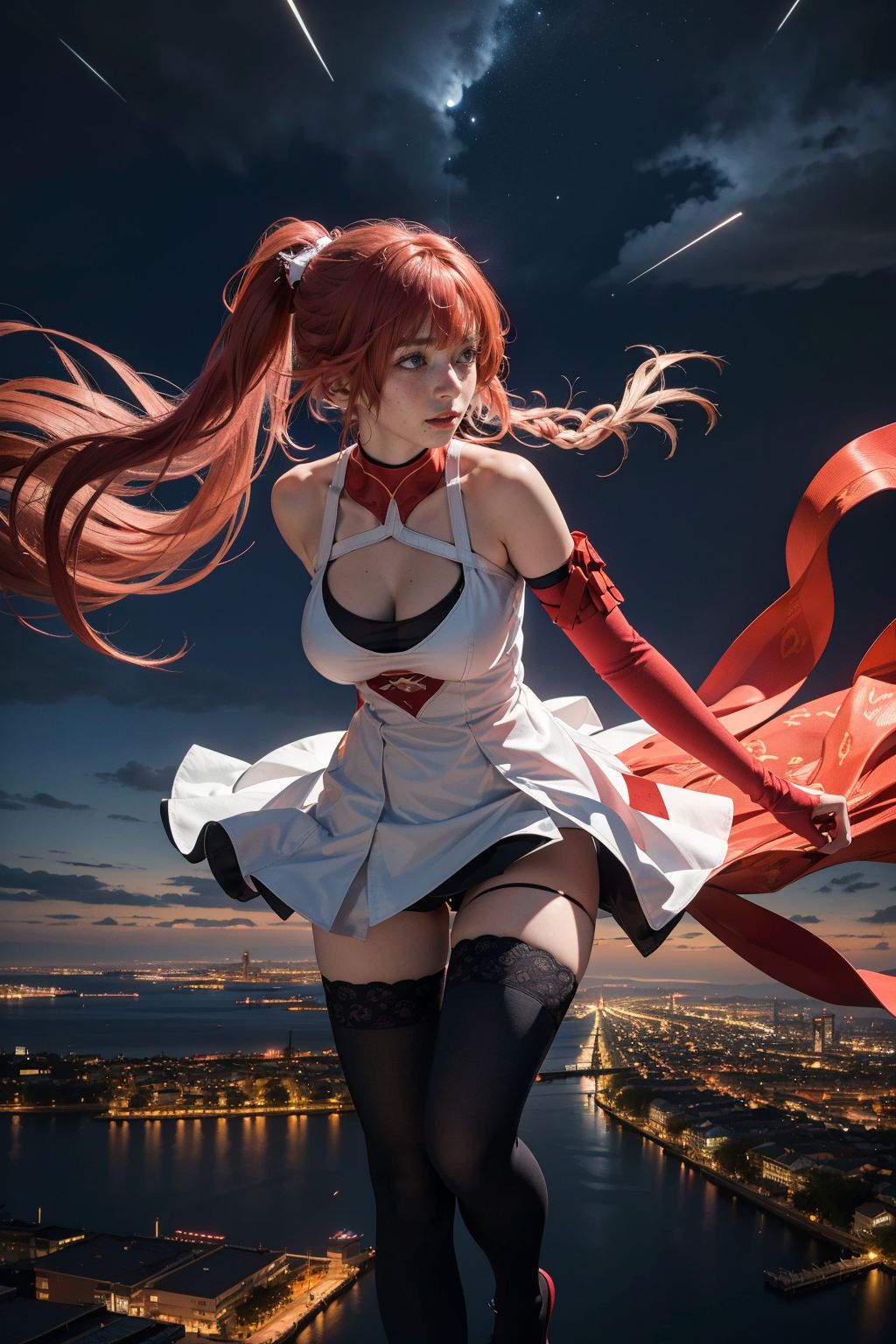 Changli,Fusion Natural Resonator in Wuthering Waves,The image captures a striking scene of a woman in cosplay attire, standing on the edge of a cliff at night. Her hair is dyed a vibrant red and styled in large waves that cascade down her shoulders. Shes dressed as Chun Li from Street Fighter II, donning a white apron with a bold red X emblazoned on it and black stockings.In her left hand, she wields a sword with a long red handle and a gleaming silver blade. Her right arm is extended outwards, while her left arm is bent at the elbow, creating a dynamic pose that suggests action or preparation for battle.The backdrop to this scene is as dramatic as the figure herself. The city skyline stretches out behind her, bathed in the soft glow of distant lights against the dark canvas of the night sky. Above it all, stars twinkle like distant diamonds, adding an element of wonder to the scene.Every element in this image comes together to create a vivid tableau, from the womans detailed costume to the dramatic cityscape and starry sky. Its a snapshot of a moment frozen in time, full of life and energy.
