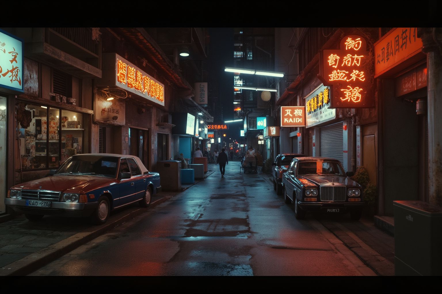 Fantasy Night StreetThe image captures a lively scene from a street in Hong Kong at night. The street is bustling with activity, illuminated by the vibrant neon signs that adorn the buildings on either side. These signs, glowing in hues of red and orange, add a warm hue to the otherwise darkened surroundings.A handful of people can be seen strolling along the sidewalk, their figures adding a sense of movement to the scene. Their exact number is hard to determine due to the darkness, but they appear to be few in count.Two cars are parked on the side of the street, one painted in a bright shade of blue and the other in a darker red. They are stationary, contrasting with the dynamic life unfolding around them.The precise locations of objects are difficult to ascertain without additional context, but the cars are clearly parked along the side of the road, while the people are walking on the sidewalk adjacent to the buildings.There is no discernible text in the image, and the relative positions of objects suggest a typical urban street layout with buildings lining the sides and a clear path for pedestrians and vehicles.This description is based on the visible elements in the image and does not include any speculative or imaginary content.