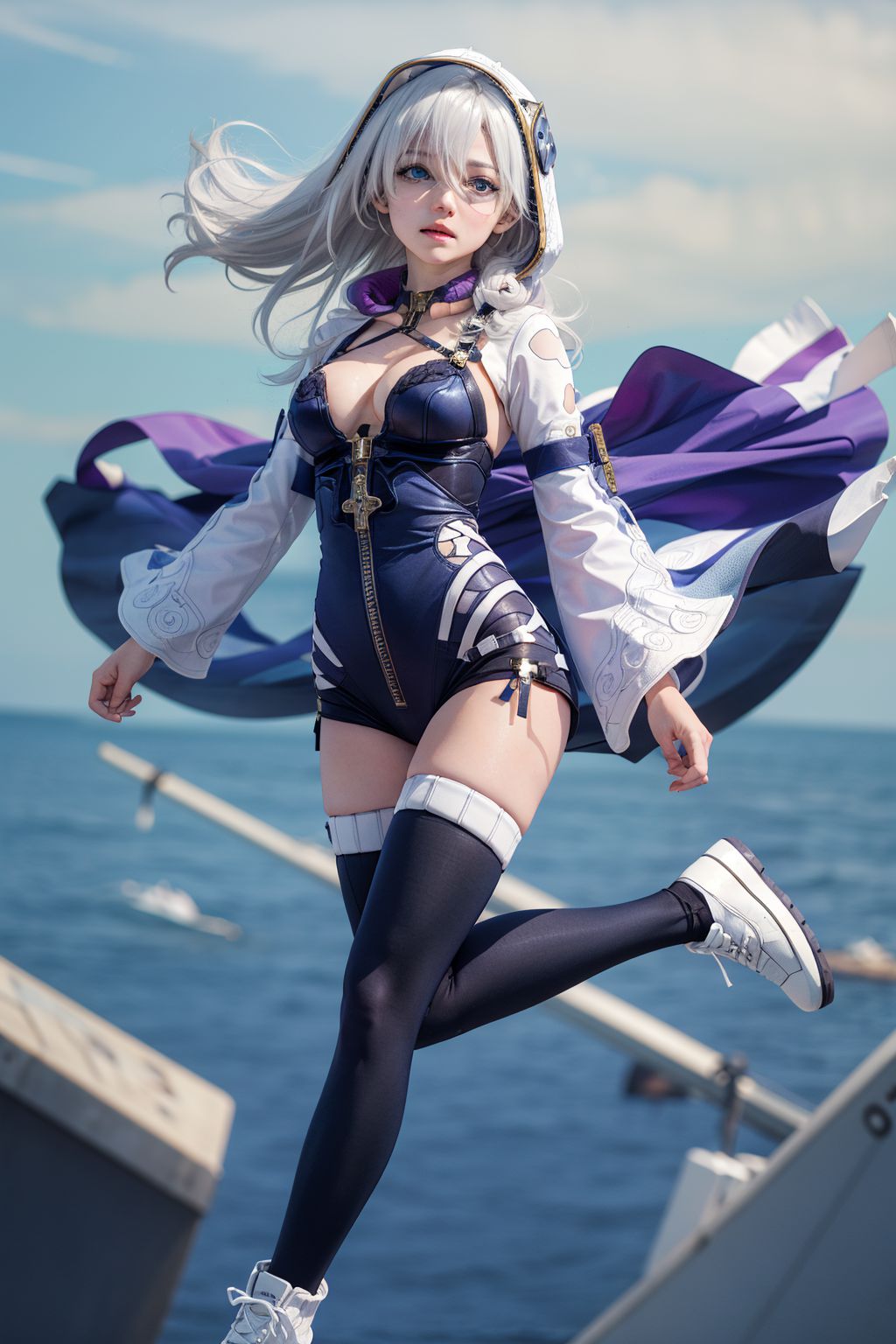 Teresa destiny cannot be escapedIn the center of the image, a female character is captured in mid-air on a ship. Shes dressed in an eye-catching outfit that features a black and white striped bodice with gold accents, paired with blue leggings. Her hair, styled into white waves, contrasts with her silver crown. Shes holding a purple cape in one hand and a sword in the other, suggesting an air of authority or perhaps readiness for battle. The ship beneath her is a significant element in this scene, characterized by its white body contrasted with blue sails.The backdrop to this dramatic tableau is a clear blue sky dotted with fluffy white clouds. The image does not contain any discernible text. The relative positions of the objects confirm that the character is above the ship and the sword and cape are held outwards from her central position in the air. This detailed description provides an overview of the images content based on what can be confidently determined from it.