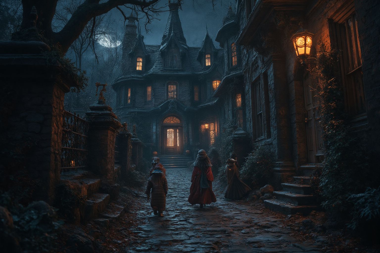 A dark and eerie alleywayThe image captures a dramatic scene from the 2015 film Crimson Peak. The setting is a cobblestone street under a dark, cloudy sky. Dominating the background is an old mansion with a tower and several turrets, its grandeur accentuated by the darkness of the night.Two individuals are seen walking towards the mansion. One person is dressed in a vibrant red coat while the other sports a white one. Their destination appears to be the entrance of the mansion, which can be identified by its large archway adorned with columns and a lantern hanging above it.To the left of the image, a stone wall adds an element of fortification to the scene. On the right side, theres a building with a staircase leading up to it, perhaps hinting at multiple levels within this mysterious dwelling. The precise positioning of these elements creates a sense of depth and perspective in the image.Overall, the image is a still from the film, capturing a moment of anticipation as the two figures approach the mansion under an ominous sky.