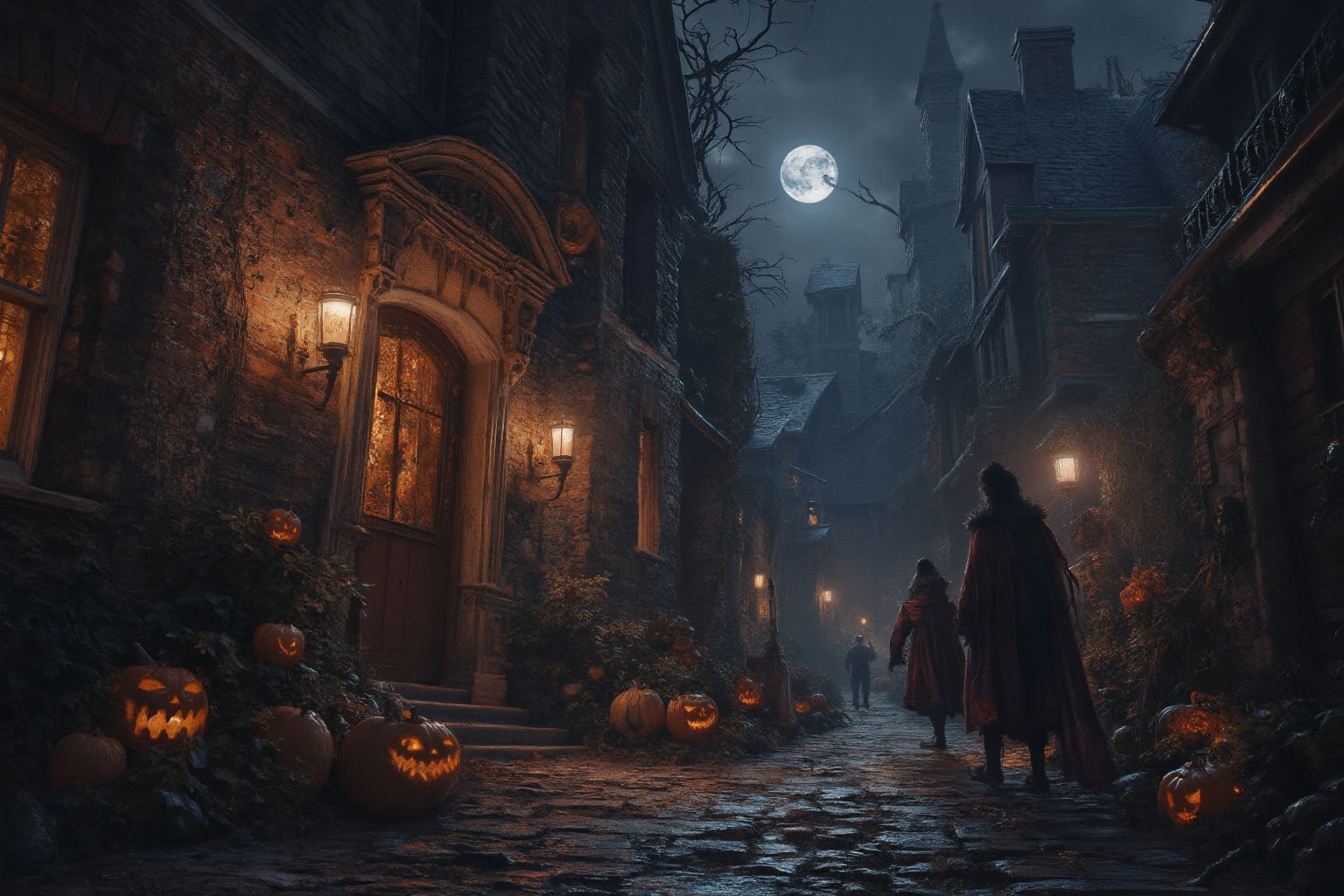 A dark and eerie alleywayThe image captures a scene from the movie Harry Potter and the Half-Blood Prince. The street, shrouded in darkness, is lined with stone buildings on either side. These buildings are adorned with jack-o-lanterns, their carved faces glowing with an eerie light. Two individuals can be seen in the distance, walking away from the camera. The sky above them is a somber blue, and a full moon hangs low in the sky, casting a soft glow that subtly illuminates the scene. The overall atmosphere is one of mystery and intrigue, characteristic of the Harry Potter series.