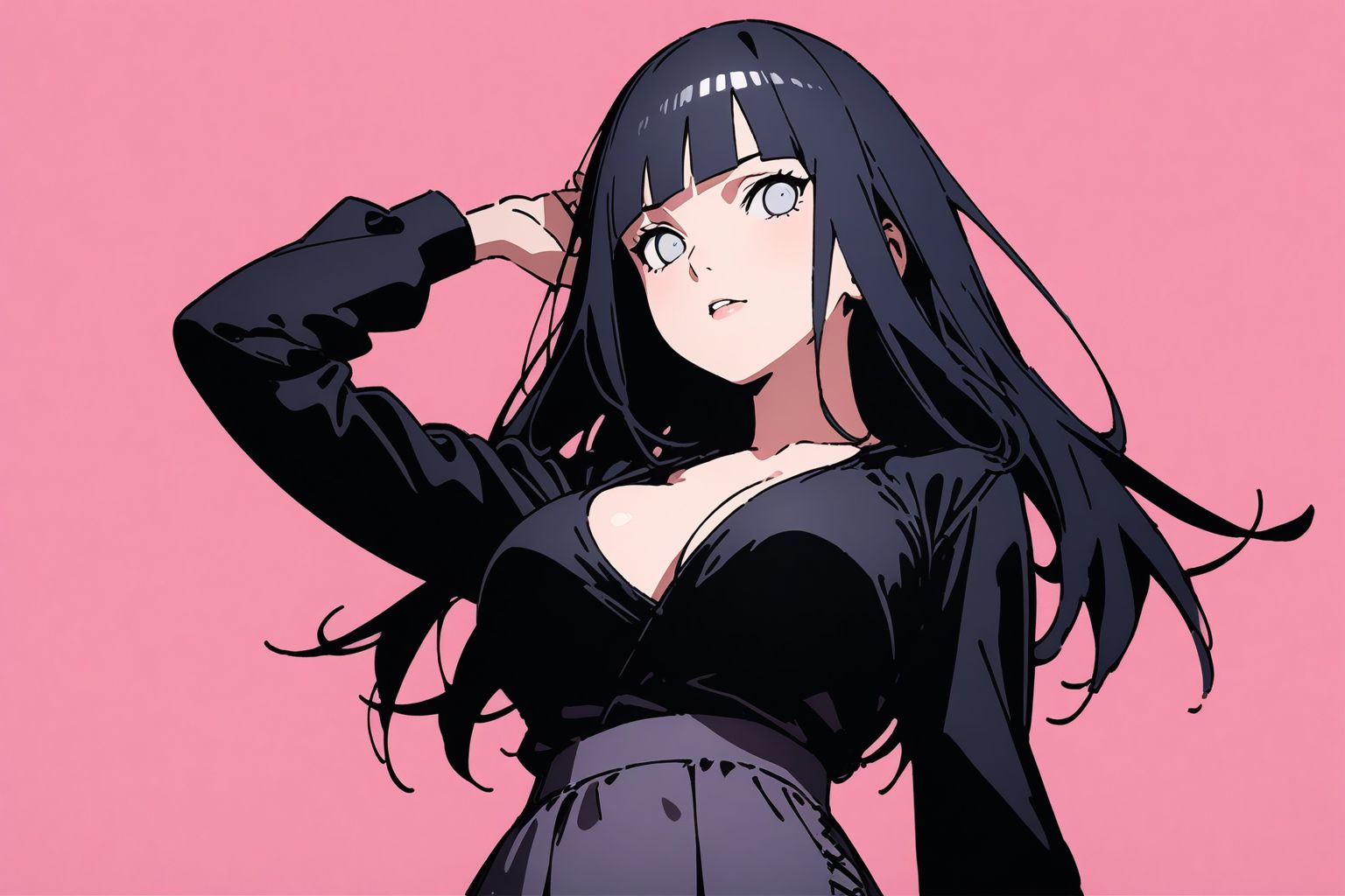 Naruto Hyuga HinataIn the image, a woman with long black hair is captured in a dynamic pose. Shes dressed in a black top and pants, which contrast sharply against the pink background. Her left hand is confidently placed on her hip, while her right hand holds a cigarette, suggesting a sense of rebellion or nonchalance. The womans gaze is directed upwards and to the left, indicating that she might be looking at something or someone off-frame. The image does not contain any discernible text. The overall composition of the image places the woman as the central focus against a vibrant backdrop.