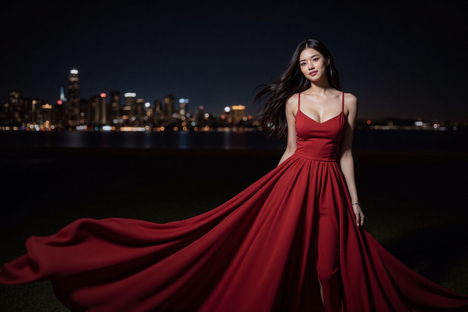 Red dressIn the image, a woman is standing on a grassy field under the night sky. She is dressed in a vibrant red dress that features a deep V-neck and cap sleeves. The skirt of her dress flows down to form a train behind her, adding a sense of movement to the scene. Her hair, styled loose, complements her attire.The womans gaze is directed off to the side, suggesting she might be looking at something or someone out of frame. Her posture suggests she is posing for the photo, perhaps capturing a moment of quiet reflection amidst the grandeur of her surroundings.In the background, a city skyline stretches across the horizon, its myriad lights twinkling in the darkness like stars brought down to earth. The contrast between the natural field and the urban backdrop creates a striking visual narrative.There is no discernible text or countable objects in the image. The relative positions of the objects suggest that the woman is closer to the foreground, while the city skyline is further away, providing depth to the scene. The overall composition of the image places the woman as the central focus, with her surroundings serving to enhance her presence.