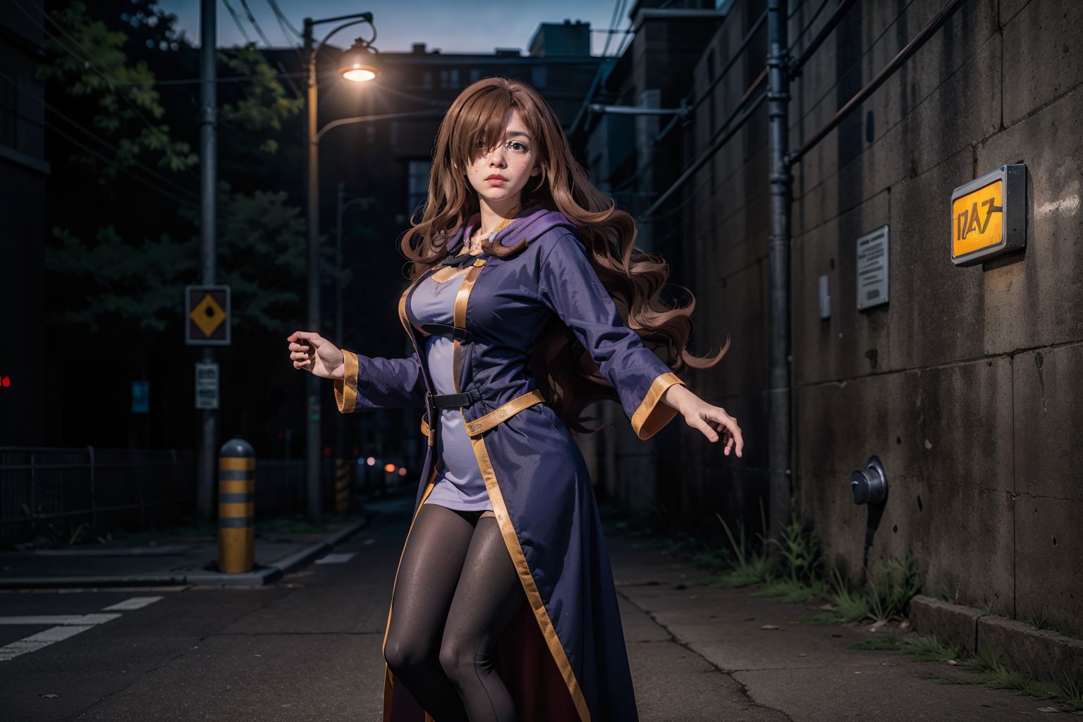 Wiz KonoSuba RavenAeyeIn the image, a woman with long brown hair cascades down her shoulders. She is adorned in a blue robe and leggings, decorated with gold accents that add a touch of elegance to her attire. In her hand, she holds a black object, the purpose of which is unclear from the image.She stands on a street corner, her posture poised as if ready to step forward. The backdrop to this scene is a concrete wall, upon which hangs a sign with yellow lettering that reads KAS. The setting suggests a city environment, further emphasized by the presence of a traffic light and street signs in the background. The womans position on the sidewalk, combined with her attire and the urban surroundings, creates an intriguing tableau. The image does not provide additional text or context to clarify the womans identity or actions.