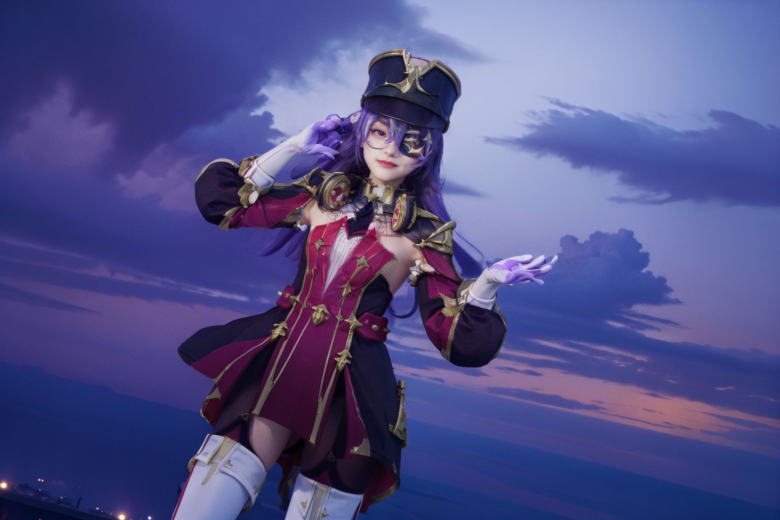 Chevreuse 3rdThe image captures a scene of a person dressed as a character from the anime series Sailor. The individual is adorned in a vibrant red and gold outfit, complete with a matching hat that is accentuated by a feather. In their right hand, they hold a sword, while their left hand grasps a shield, both essential tools for any sailor.The person stands against the backdrop of a deep blue sky, which contrasts starkly with the warm orange hues of the sunset. The colors in the image are predominantly red, gold, and purple, creating a visually striking scene.In terms of object count, theres one person dressed as a character from Sailor, one sword held in their right hand, and one shield held in their left hand. The precise location of these objects is not specified beyond the person standing against the sky.There are no discernible texts or relative positions between different objects that can be confidently determined from the image description provided. The actions of the objects are also not specified beyond the implied action of the person holding the sword and shield, which suggests a readiness for an impending battle. This description is based solely on the visible content of the image and does not include any speculative or imaginary details.
