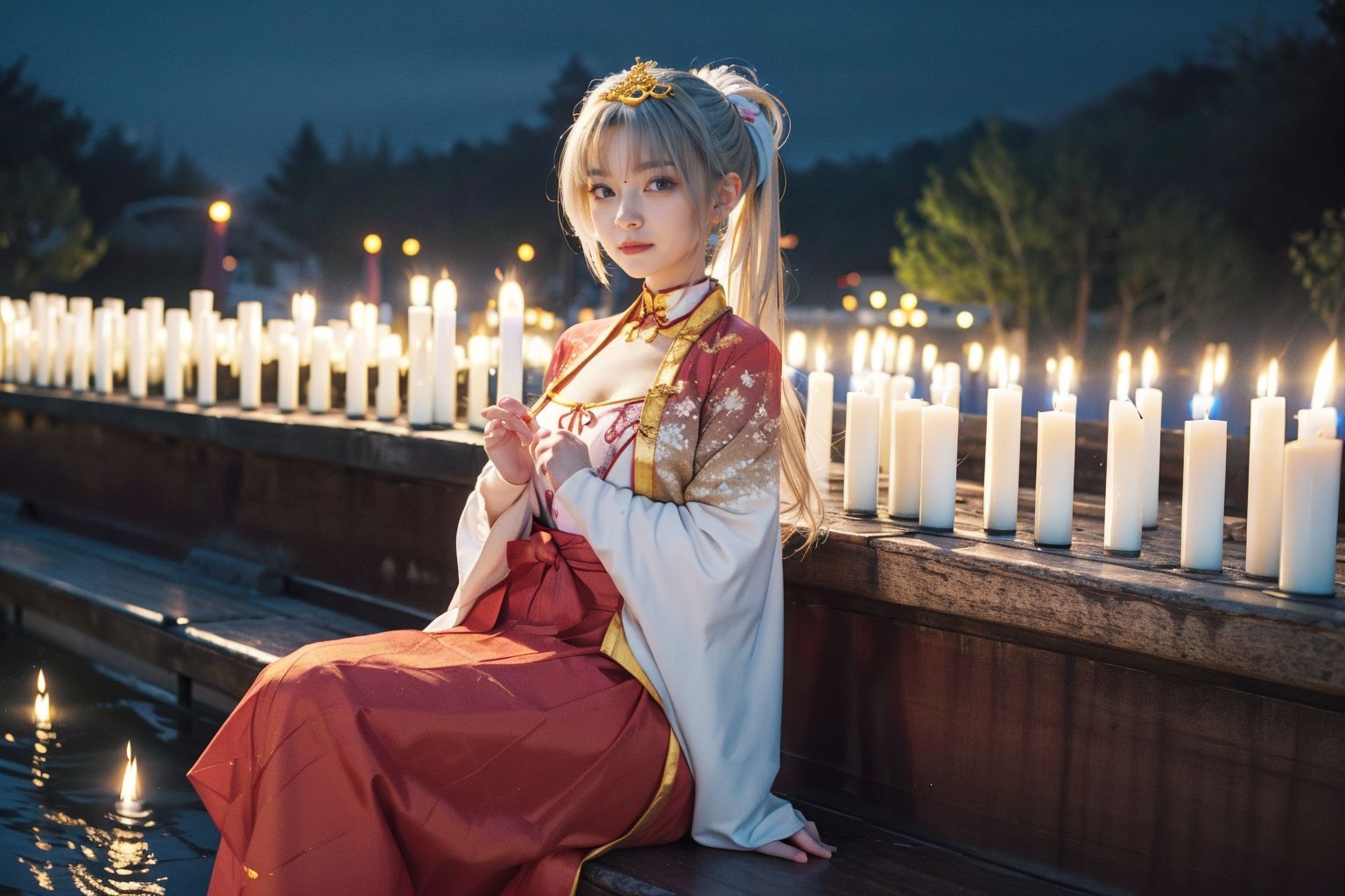 Tomotake Yoshino Senren BankaIn the image, a young woman with blonde hair is captured in a serene moment. Shes dressed in a traditional Chinese outfit, painted white and adorned with gold accents that shimmer under the light. The vibrant red of her skirt contrasts beautifully with her attire.She sits on a wooden bench, which adds a rustic charm to the scene. In front of her are two rows of lit candles, their warm glow reflecting off her face and casting long shadows around her. Each candle is housed in a white holder, creating an array of soft light that illuminates the woman and the path behind her.The background reveals a tranquil night-time setting with trees standing tall under the starlit sky. The path behind the bench appears to be quiet and empty, adding to the peaceful ambiance of the scene.Every element in this image comes together to create a captivating portrait of tradition meeting tranquility, set against the backdrop of a serene night-time landscape.