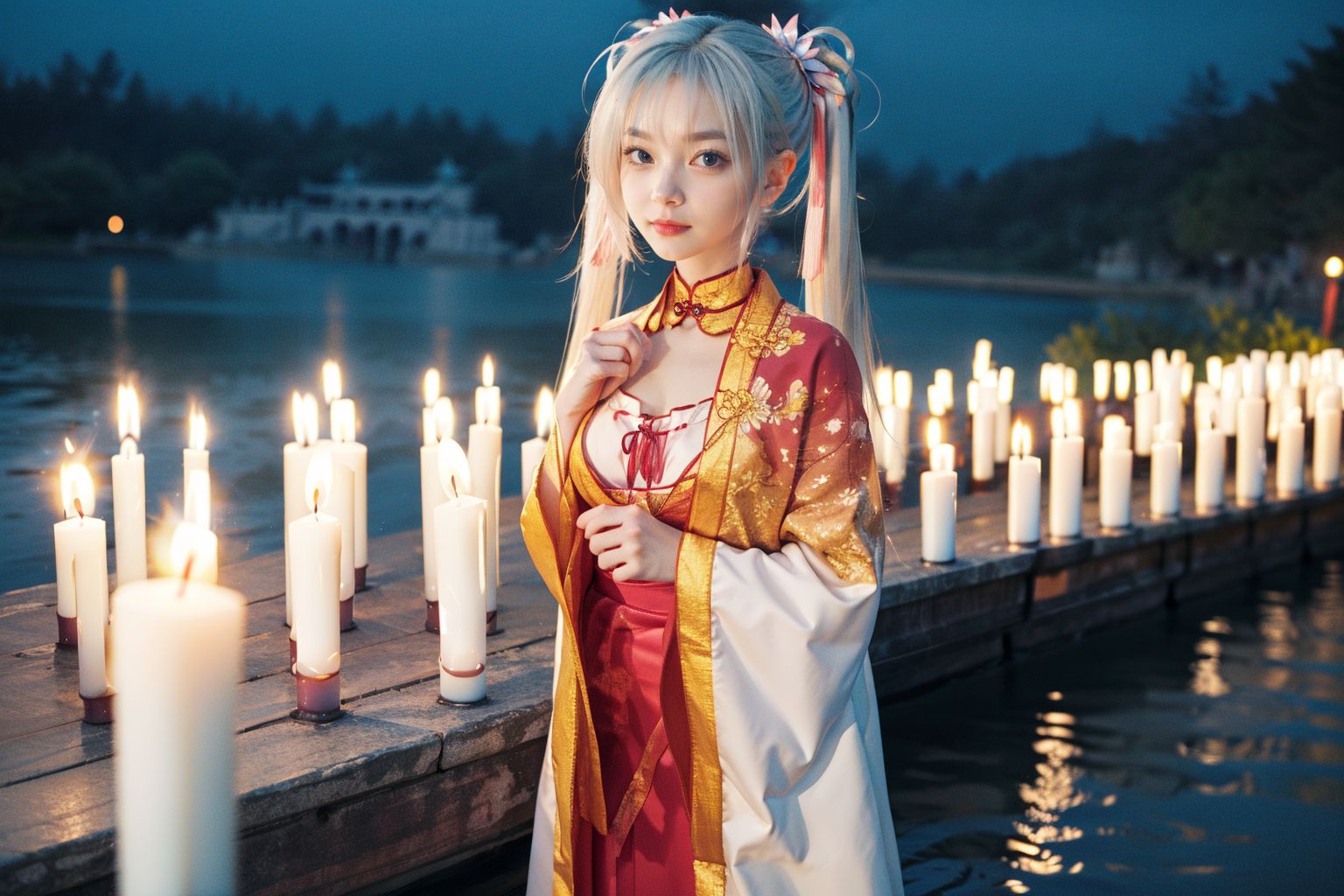 Tomotake Yoshino Senren BankaIn the tranquil setting of dusk, a young woman stands poised on a wooden dock that stretches out over a serene lake. Her hair, a pale blonde color, is neatly pulled back into a bun, adorned with a delicate pink flower that adds a touch of elegance to her appearance. She is dressed in traditional Chinese attire, the vibrant colors of red and gold standing out against the peaceful backdrop.The womans right hand gently holds a white candle, its flame flickering softly in the dimming light. In front of her, a line of candles casts a warm glow on the dock, their flames dancing in harmony with the surrounding stillness. The candles are evenly spaced along the length of the dock, creating a path of light that leads towards the calm expanse of water beyond.In the distance, across the lake and nestled at the foot of a hill, lies a house bathed in soft light. Its presence is subtle yet undeniable, adding another layer of depth to this picturesque scene. The overall image paints a picture of quiet reflection and peaceful solitude, captured under the watchful gaze of dusk.