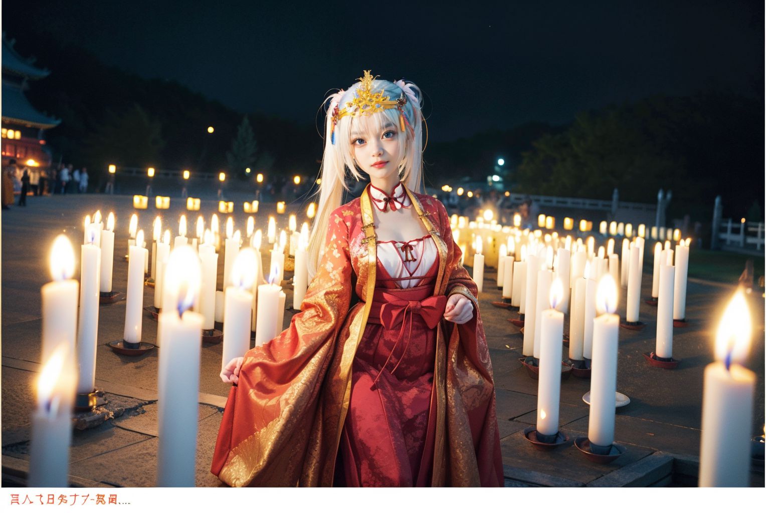 Tomotake Yoshino Senren BankaIn the heart of a serene park, under the cloak of night, stands a young girl with blonde hair. She is adorned with a crown of gold leaves that glisten under the soft glow of the surrounding candles. Her attire is a vibrant red dress, accentuated by a pair of golden shoes that shimmer in the ambient light.The girl holds a white flower delicately in her hands, its petals unfurling softly in the gentle breeze. She stands before a row of tall, flickering candles that cast dancing shadows around her. These candles are neatly arranged on both sides of her, their warm light illuminating the scene with an ethereal glow.The park itself is shrouded in darkness, save for the radiant light emanating from the candles and the distant buildings that loom in the background. The entire scene paints a picture of tranquility and beauty, captured under the enchanting cover of night.