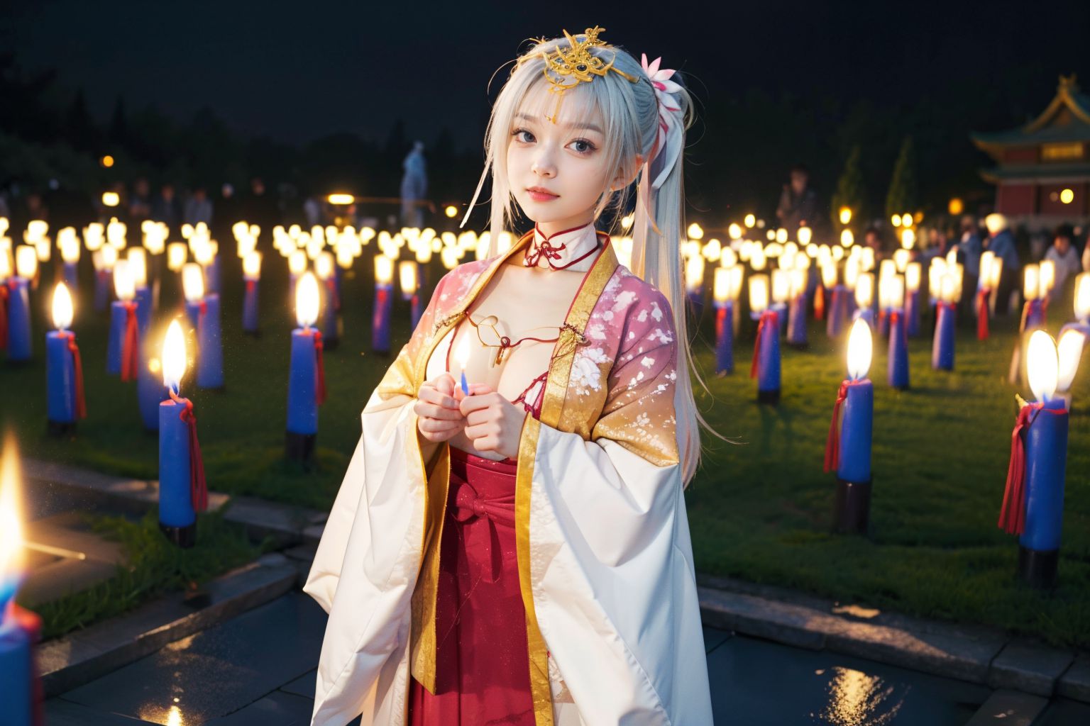 Tomotake Yoshino Senren BankaIn the heart of a serene park, a young woman stands as the focal point of the image. Her white hair cascades down her back, contrasting with the red and gold of her traditional Japanese attire. A pink flower is nestled in her hair, adding a touch of color to her ensemble.She holds a blue candle in each hand, their flames dancing merrily. The candles are not alone; they share their space with numerous other candles that surround her, their bright light illuminating the park around them.The park itself is a tranquil setting. A pond lies in the background, its surface calm and undisturbed. Trees rise up around the pond, their leaves rustling gently in the breeze. Nearby, a temple stands, its architecture hinting at a rich cultural heritage.Every element in this image comes together to create a scene of peaceful solitude, with the woman and her candles at its center.