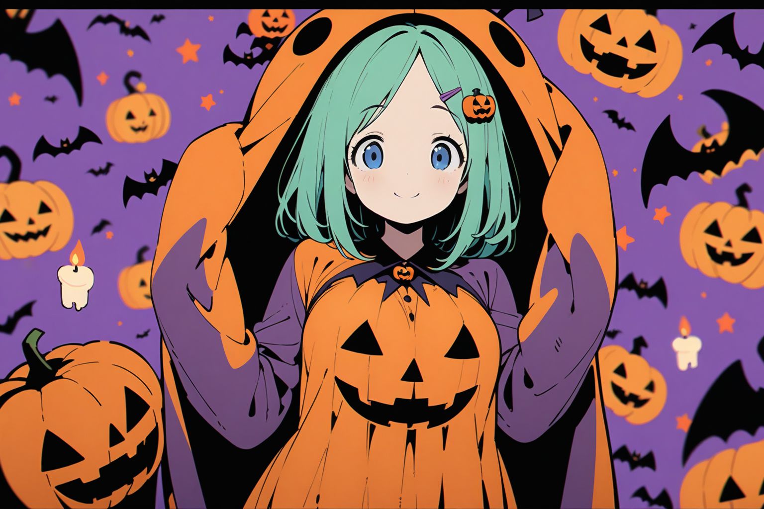 Halloween GirlIn the center of the image, a girl with vibrant blue eyes and long green hair is the main focus. Shes dressed in an orange Halloween costume that features a purple cape and a pumpkin face on her chest. Her gaze is directed towards something or someone outside of the frame, giving off an air of curiosity or anticipation.The backdrop is awash with shades of purple and black, creating a stark contrast with the girls bright attire. Scattered throughout this dark canvas are multiple jack-o-lanterns in various sizes and orientations. The number of jack-o-lanterns is too numerous to count accurately from the image.Despite the multitude of elements, the girl remains the central figure, drawing attention amidst the Halloween-themed imagery. The overall composition of the image suggests a festive or celebratory event, likely related to Halloween given the presence of the jack-o-lanterns.