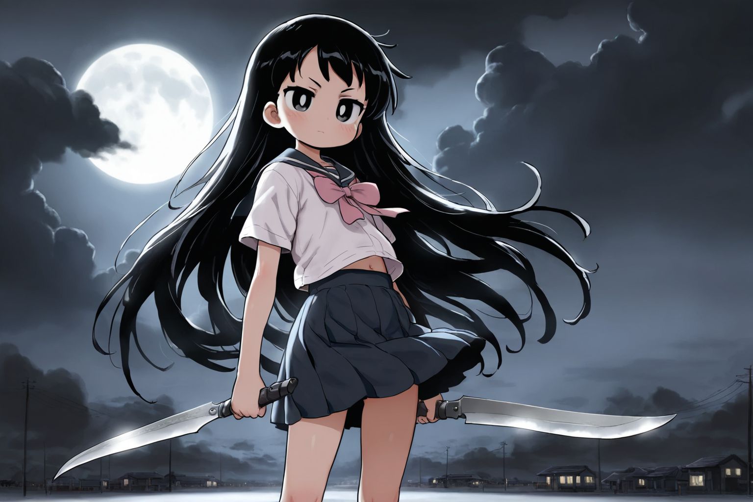 Killer GirlThe image portrays a scene from the anime Black Bullet. The central figure is the character Ina Kusabi, who is standing amidst a stormy night. She is holding a large sword with both hands, ready for battle. Her attire consists of a white blouse adorned with a pink bow and a blue skirt, which contrasts with the dark background.The setting appears to be a cityscape, with buildings visible in the distance under the moonlight. Ina Kusabis position on the left side of the image gives a sense of space and movement towards the right side where the city lies. The overall composition of the image suggests an impending battle or conflict in this fictional universe.