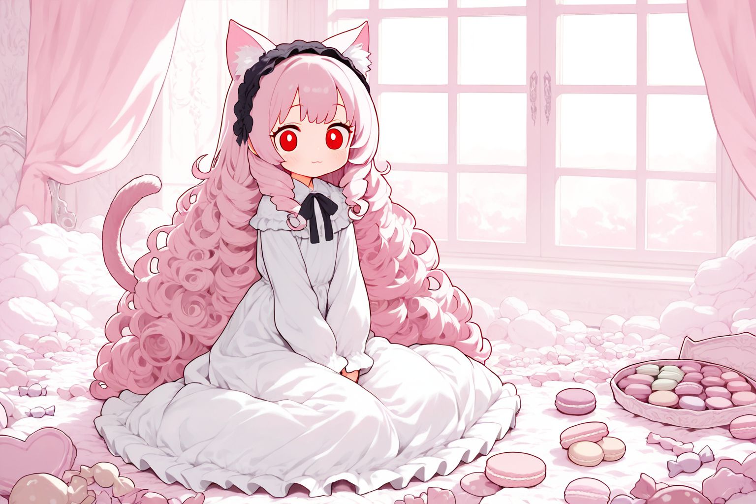 Little Pink GirlIn the center of a room bathed in soft pink light, a cat is the star of the scene. The cat, with its long, curly pink hair cascading down and matching ears perked up, is sitting on a white rug adorned with ruffles. Its eyes, wide open, are gazing off to the side, as if something has caught its attention.The room itself is awash in shades of pink, creating an atmosphere thats both whimsical and dreamy. On one wall hangs a window, through which a few rays of light filter into the room, casting a warm glow on the floor. Scattered around the cat are small cakes, their pink icing matching the rooms color scheme perfectly.Every object in this image is stationary, frozen in a moment of time. The cat is not engaged in any action, but its attentive gaze suggests it might be observing something or someone outside the frame. Theres no text present in the image, and the relative positions of the objects suggest a casual setting where the cat has made itself comfortable on the rug.This image is a snapshot of a moment, a glimpse into a world thats as pink and whimsical as the cat sitting in the center. Its a scene filled with color and detail, each element contributing to the overall ambiance of the room.