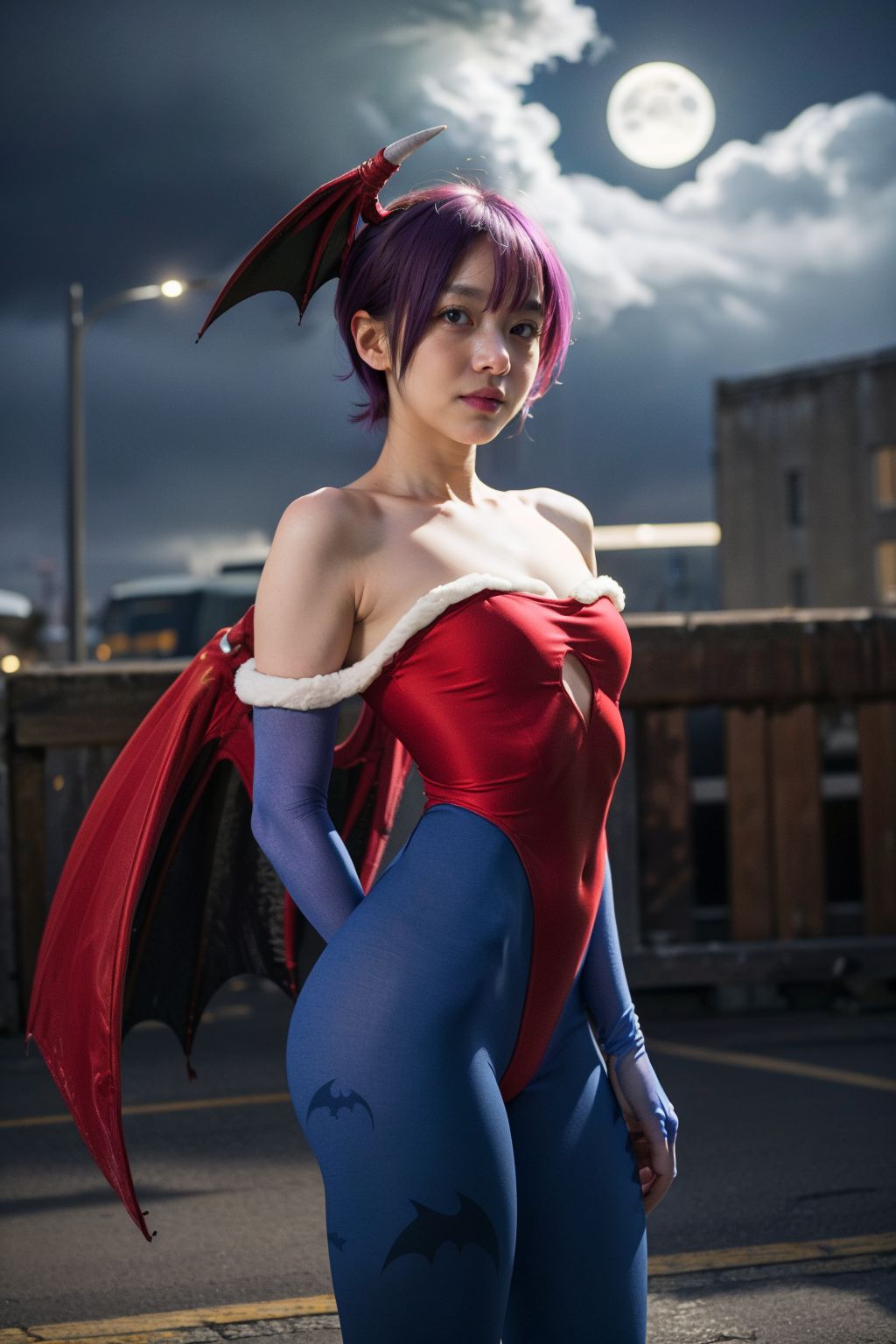 Lilith Aensland DarkstalkersIn the image, a young woman stands confidently on a dark street. She is adorned in a vibrant outfit that includes a red bodice and blue leggings, complemented by a white collar. Her attire contrasts beautifully with her purple hair, which is accentuated by a pair of matching earrings. In her left hand, she holds a bat, a symbol often associated with the night and mystery.Her gaze is directed off to the side, suggesting a sense of focus or anticipation. Behind her, a building can be seen, its details obscured by the darkness. Above it all, a full moon hangs in the sky, casting an ethereal glow over the scene. The womans position on the street, under the moonlight, creates a striking image that blends elements of urban life with hints of fantasy and magic.