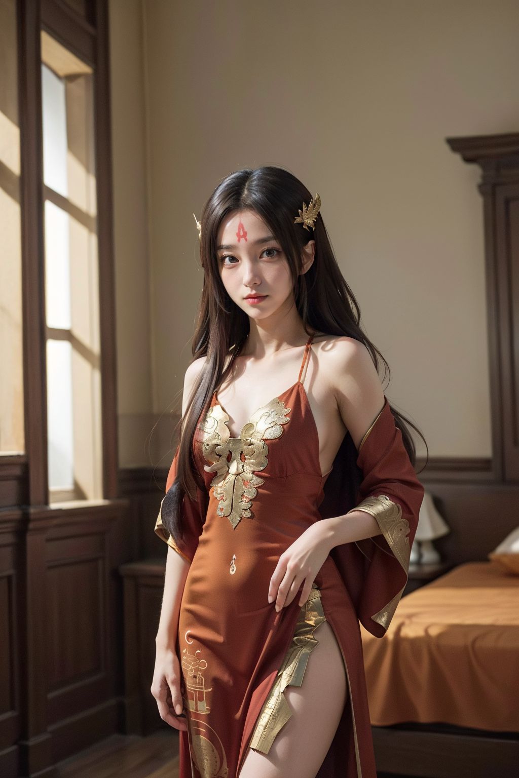 Shi Hao AuntIn the center of the image, a young woman with long brown hair is captured. She is adorned with a red headband and gold earrings that catch the light. Her outfit, a striking combination of red and gold, includes a sheer dress and pants, adding an air of elegance to her appearance.She stands against a backdrop of a wooden wall, its rich brown hues complementing her attire. On the left side of the image, a window with partially open curtains lets in soft light that illuminates the scene.To the right of the woman, theres a bed covered with a vibrant red blanket, mirroring the color of her dress and headband. The entire scene is bathed in warm tones, creating an atmosphere of comfort and tranquility.