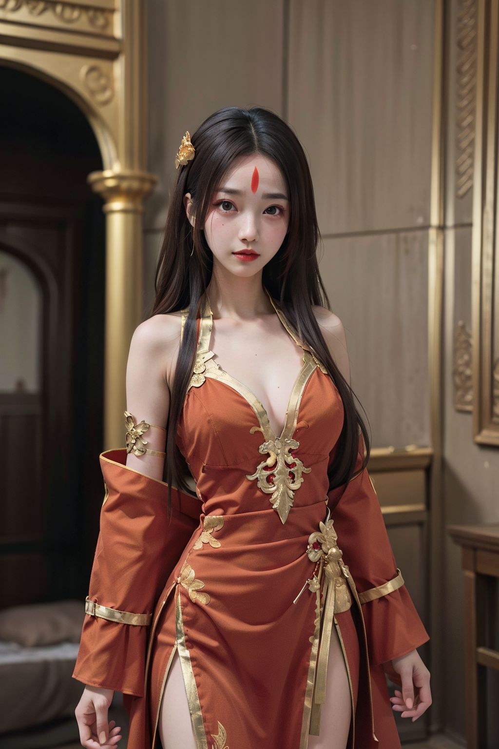 Shi Hao AuntIn the center of the image, a young woman stands confidently in a room. She is adorned in a vibrant red dress that is accentuated with gold accents, adding a touch of elegance to her attire. A matching gold headband rests on her head, complementing the gold necklace that graces her neck. Her eyes are gently closed, and she wears a serene smile on her face, exuding an air of tranquility.The room around her is softly lit, with a gold archway visible in the background. The archway frames a wooden door, adding depth to the scene. The womans position in front of the archway creates a harmonious balance between her and the architectural elements of the room. Despite the simplicity of the colors - red, gold, and brown - the image captures a moment of quiet introspection.