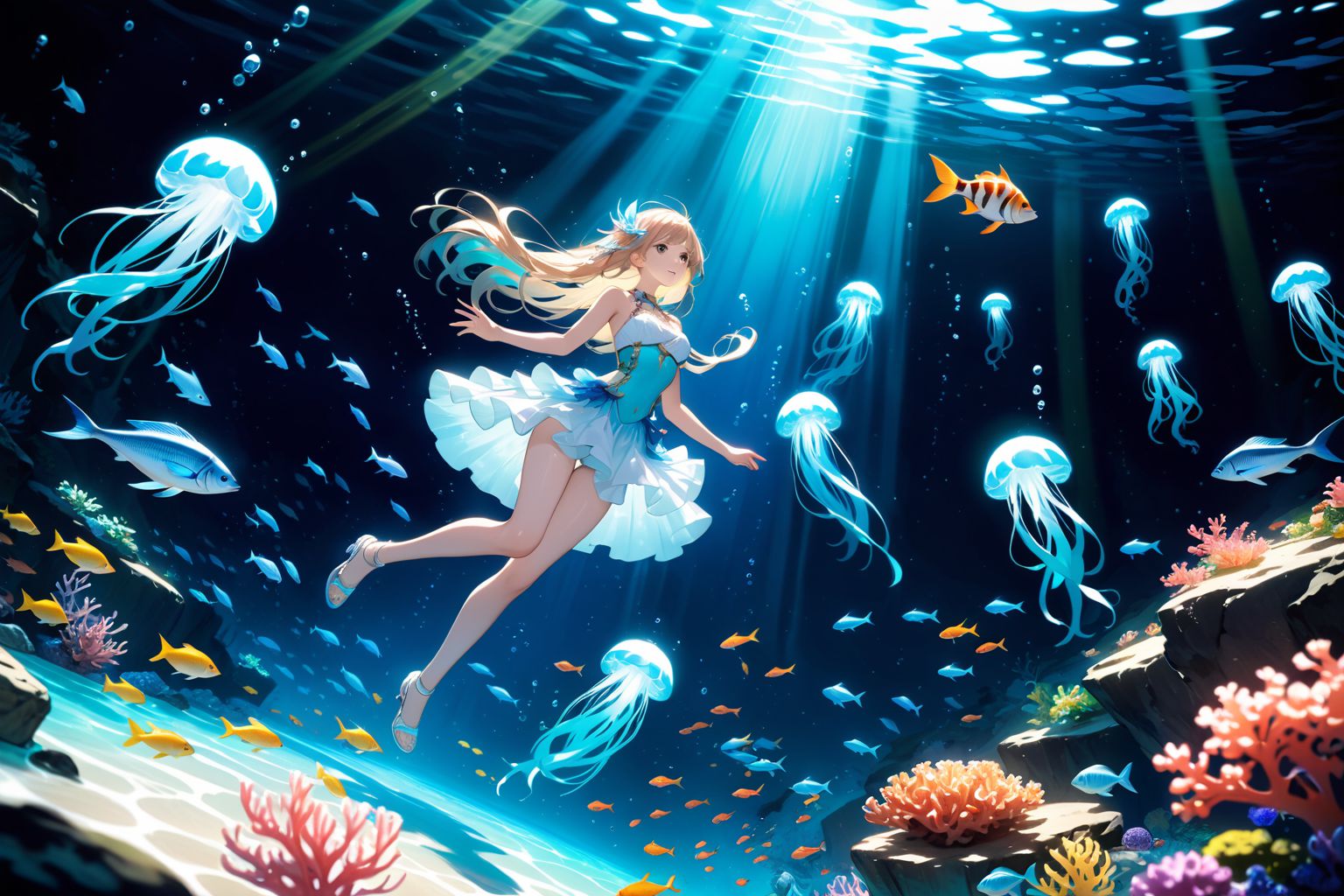 An underwater sceneIn the depths of a vibrant ocean, a young girl is captured in mid-air, her body adorned with blue and white tutus. Shes surrounded by an underwater spectacle - jellyfish floating around her, their translucent bodies glowing against the dark blue backdrop. Scattered on the ocean floor are coral reefs, adding texture to the scene.Above them, three fish of varying sizes are swimming upwards, moving towards the girl. Their direction seems to suggest they are curious about this young figure in their world.The most striking feature is a ray of sunlight piercing through the water from above. It casts a radiant glow over the entire scene, illuminating the dark blue ocean and highlighting the girls tutus and the jellyfish around her. The light reflects off the coral reefs on the floor, adding depth to the image.Every element in this image comes together to create a surreal underwater tableau, where fantasy meets reality.