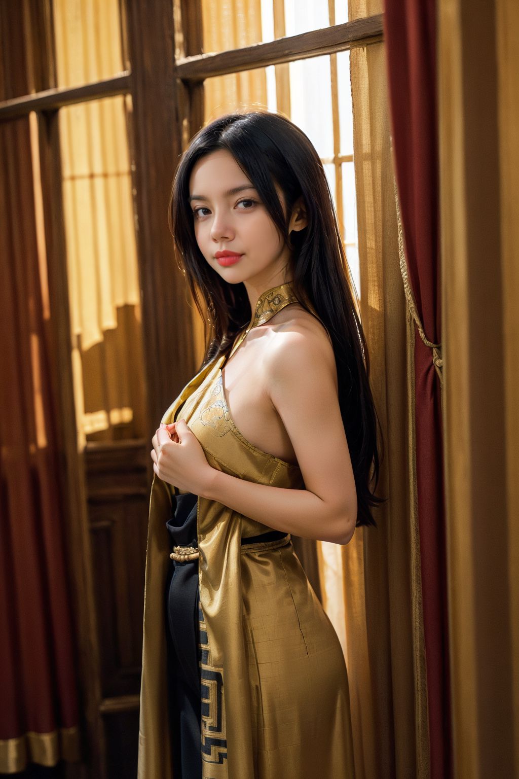 DRLLIn the image, a young woman with long black hair is captured in a moment of quiet intensity. She stands in front of a window adorned with red curtains, her posture poised and elegant. Her attire is a stunning gold dress that cascades down to form a train behind her, its color reminiscent of the suns own radiant glow. The dress is accentuated by a gold cape draped over her shoulders, adding an air of regality to her ensemble.She holds the edge of her dress with both hands, a gesture that speaks volumes about her grace and poise. Her gaze is directed off to the side, suggesting she might be lost in thought or perhaps observing something out of frame. The image captures not just her physical appearance but also hints at her inner world, making it a captivating piece of art.