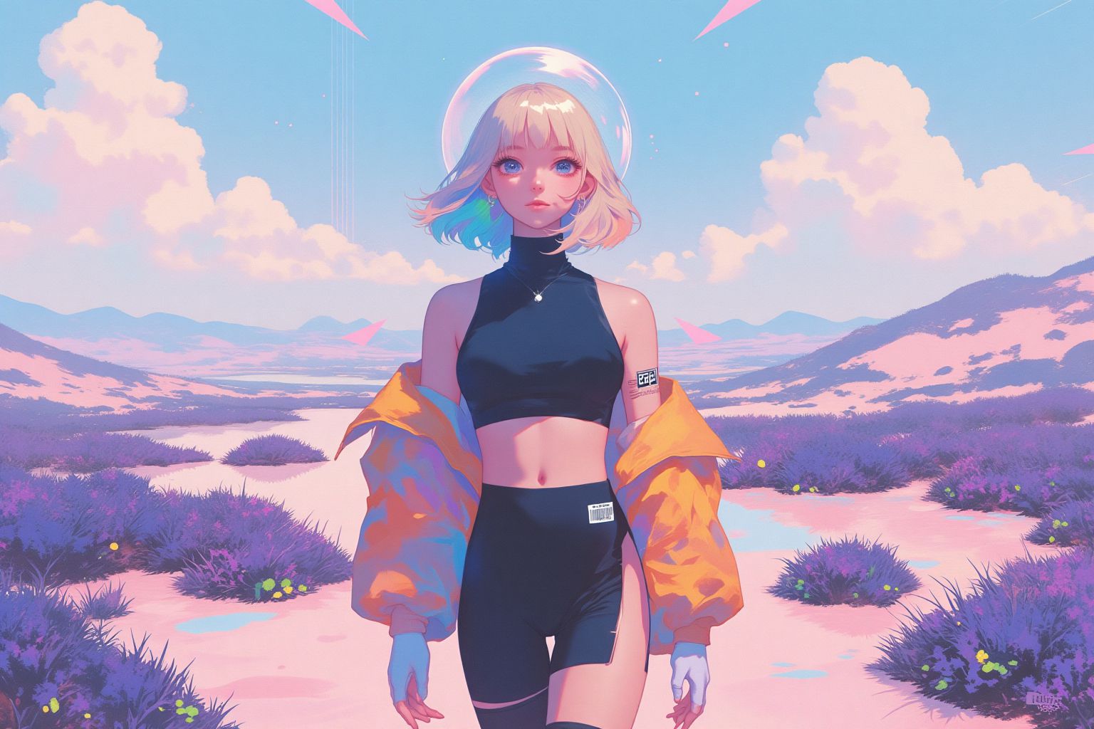 Technology and DoomsdayThe image presents a digital illustration of a young woman standing on a grassy hill. She is adorned with blonde hair and blue eyes, giving her an ethereal appearance. Her attire consists of a black crop top paired with orange pants, adding a pop of color to the scene.In her hand, she holds a white cat mask, which covers her face, adding an element of intrigue. The backdrop of the image is a picturesque landscape featuring mountains and trees under a clear blue sky dotted with fluffy clouds.The womans stance suggests she is in a state of stillness, perhaps contemplating something or simply enjoying the serene environment around her. The precise location of objects and their relative positions contribute to the overall composition of the image, creating a harmonious balance between the subject and the background. Please note that this description is based on the visible elements in the image and does not include any speculative or imaginary content.