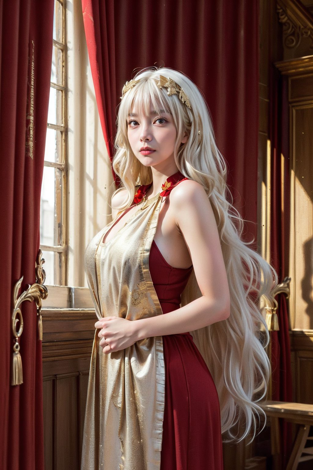 white haired girlIn the heart of a room bathed in sunlight, a young woman with blonde hair cascading down her back stands poised. She is adorned in a vibrant red dress that contrasts beautifully with her hair, and gold headpieces that glint in the light filtering through the window behind her. She holds a fan delicately in her left hand, its color matching the red of her dress. The womans position near the window allows the sun to dance on her hair, creating an ethereal effect. Her gaze is directed off to the side, as if lost in thought or perhaps admiring something outside the frame.The room itself is elegantly decorated. A chandelier hangs from the ceiling, its intricate design adding a touch of sophistication. The window behind the woman is draped with red curtains that echo the color of her dress and fan, creating a harmonious color scheme within the space.Despite the presence of these elements, the room does not contain any discernible text or additional objects. The relative positions of the objects suggest a carefully arranged scene, perhaps for a photoshoot or a special event. The womans position in front of the window, her fan, and even the chandelier all seem to be part of a deliberate composition meant to create a visually pleasing image.